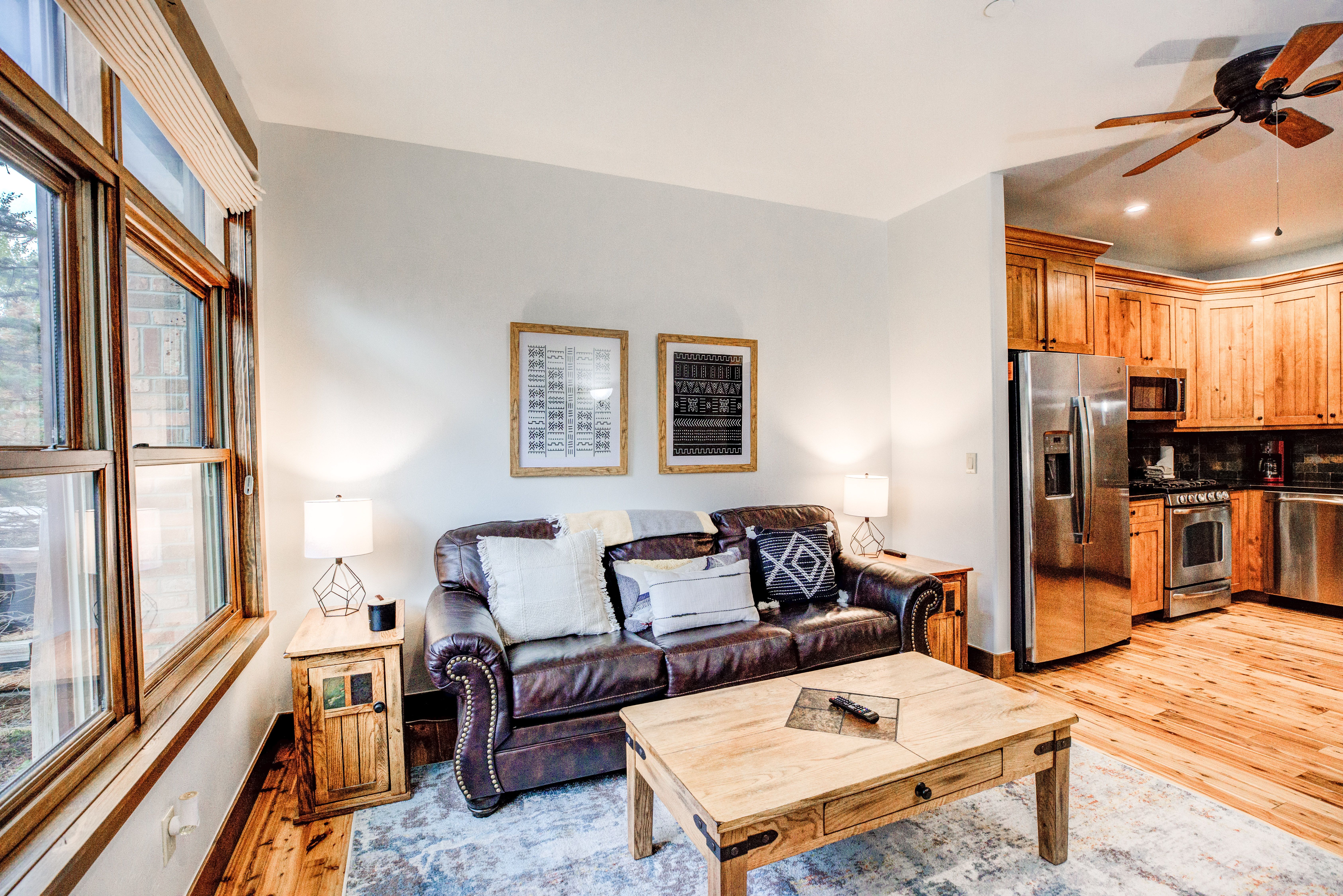 Boulevard Bend Condo is a deluxe condo that’s perfect for up to four guests. It’s designed for discriminating tastes but still maintains a cozy “mountain feel.” The living area features comfy furniture and a flat-screen TV — it’s the perfect place to kick back after your high-country adventures. The kitchen is equally nice, with granite counters, custom cabinetry, and stainless-steel appliances (including a gas range). The dining table seats three.