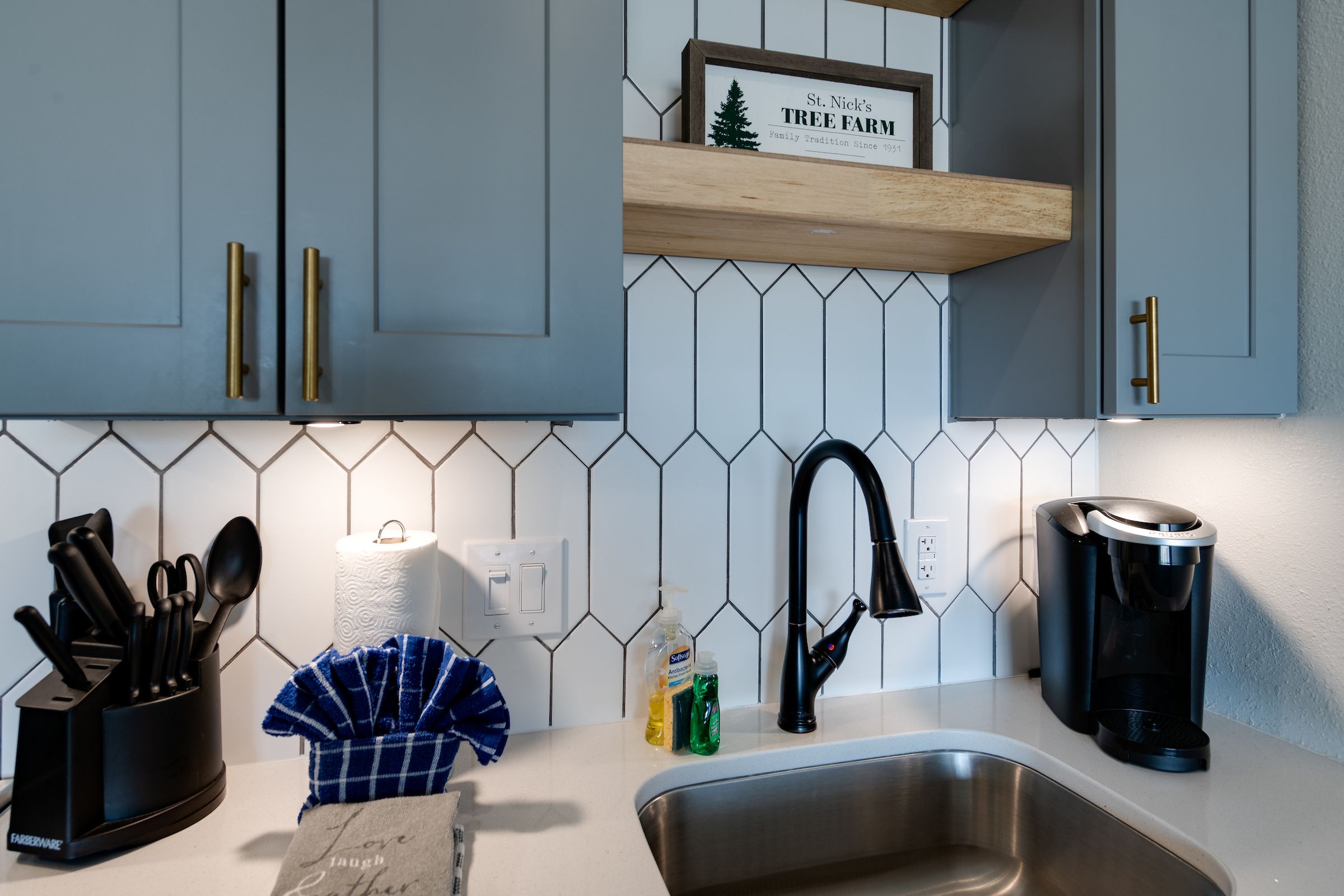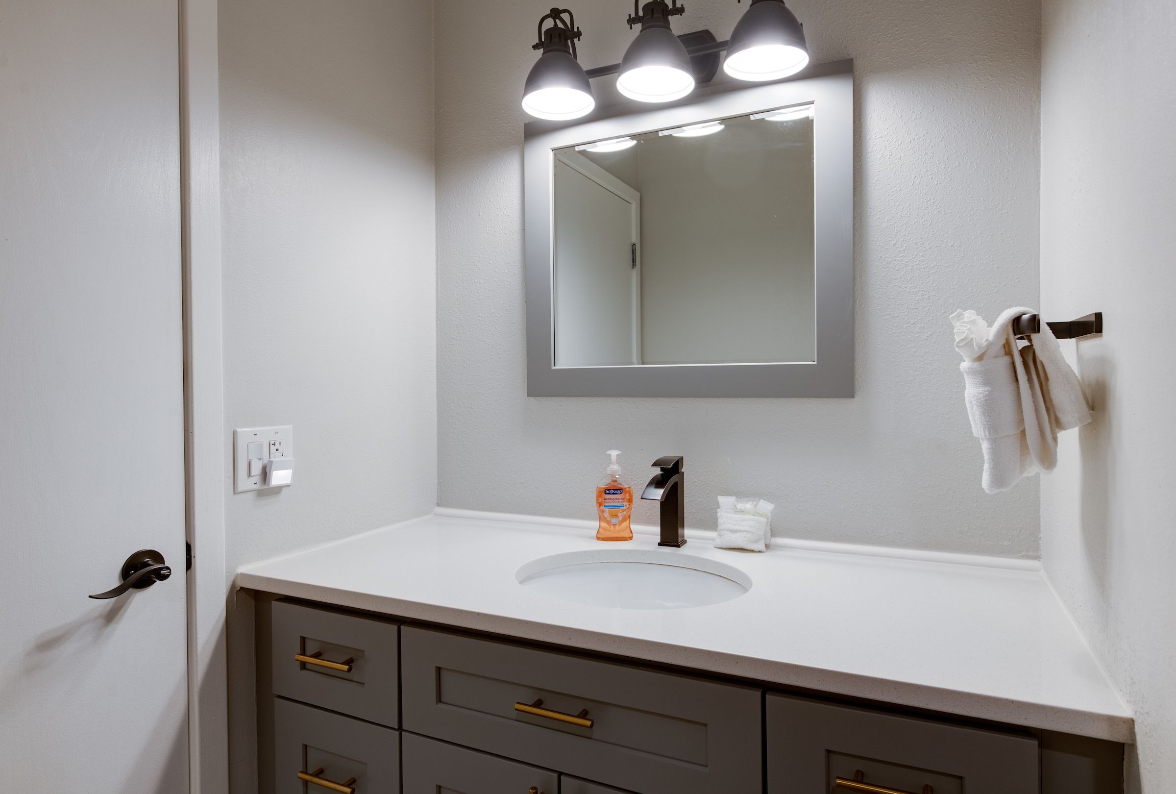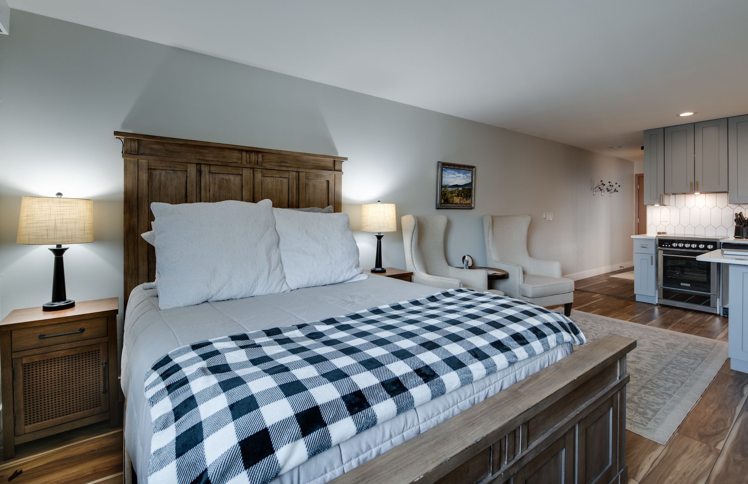 This nicely updated studio, 1-bathroom deluxe condo is a fantastic couple’s retreat! The living area is cozy and comfortable, with a large flat-screen TV with soundbar that’s great for watching the game or your favorite shows. There’s a large desk/work area for catching up on emails or other projects in a quiet, peaceful setting. The full kitchen has white quartz countertops and everything you’ll need to whip up snacks and meals including a stove, oven, fridge, microwave, and dishwasher.
