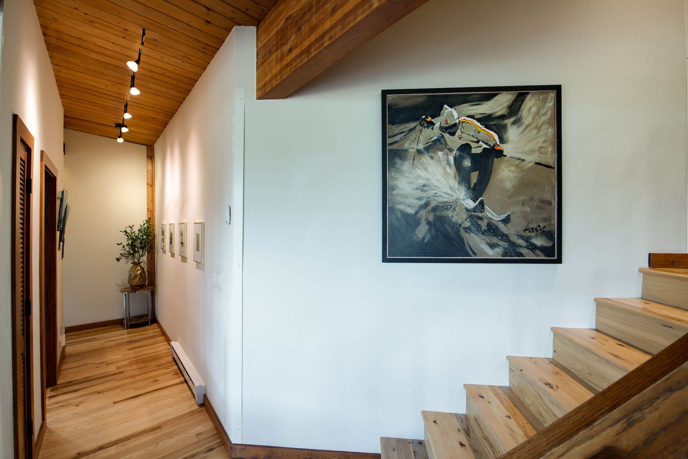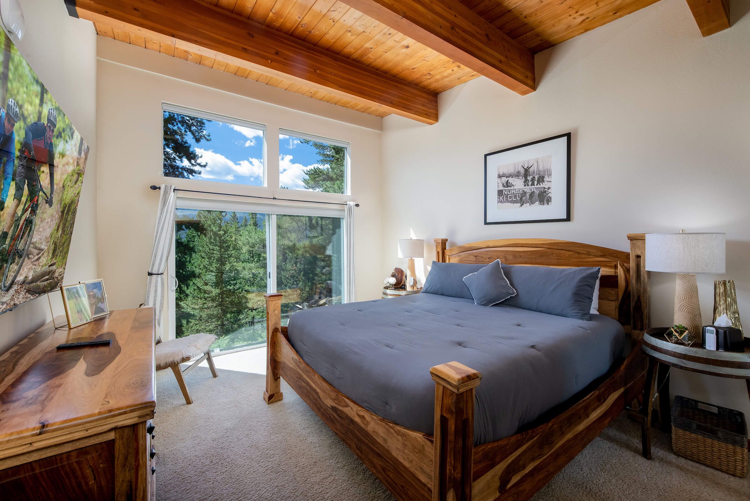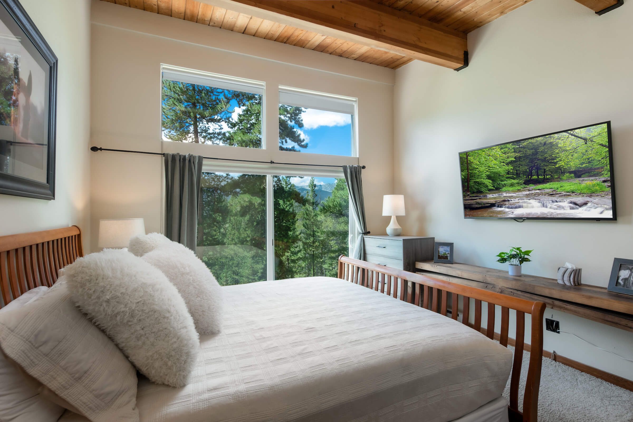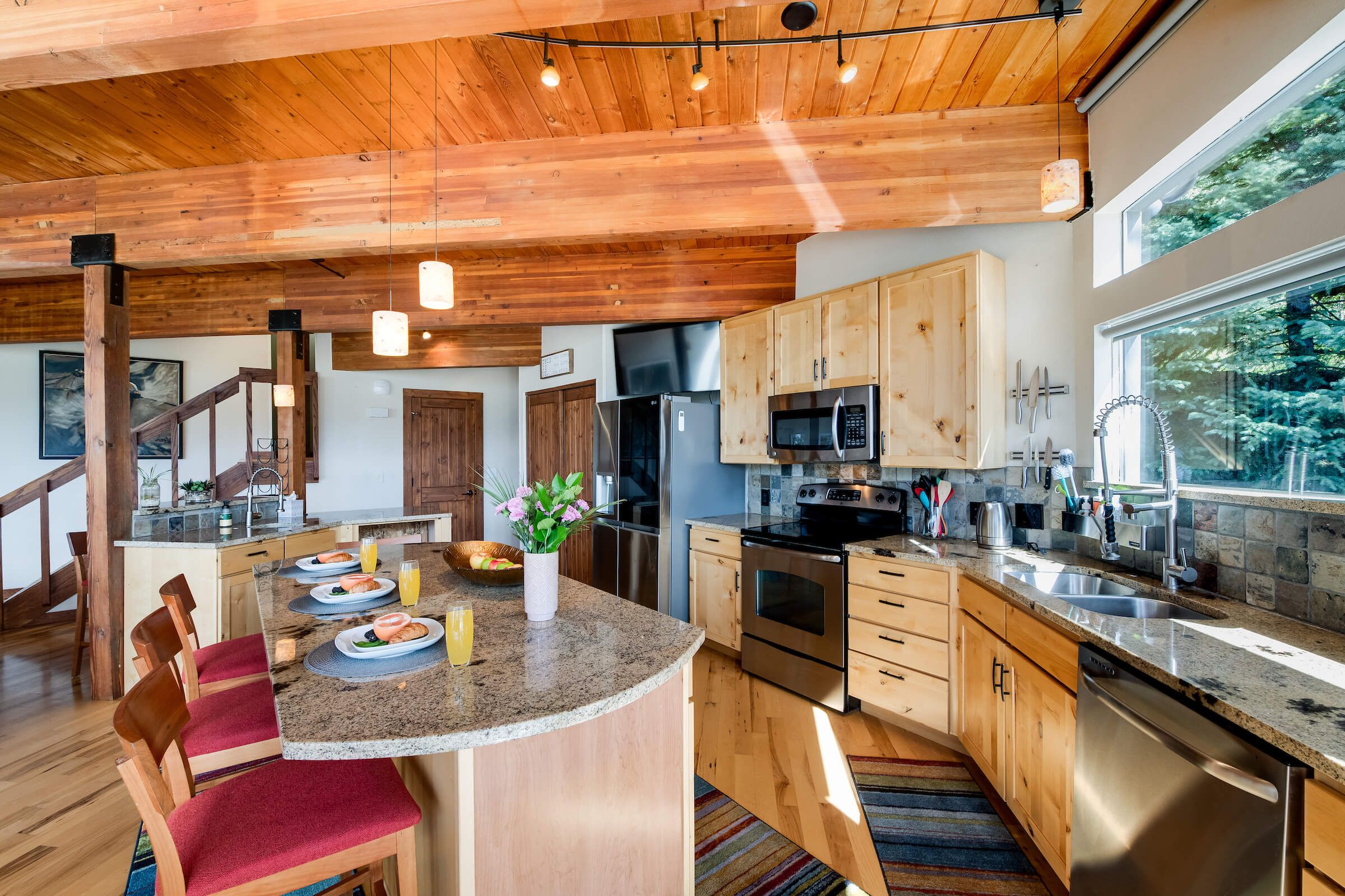 This premium 4-bedroom, 3.5-bathroom home is perfect for groups of up to ten. The living area is breathtaking, with wraparound floor-to-ceiling windows letting in the natural light and views. There’s also a huge Smart TV, a pellet stove, and plenty of comfy seating for relaxing and conversation. The kitchen features beautiful counters, stainless-steel appliances, and all the gear you’ll need to whip up everything from après-ski snacks to memorable holiday meals. There’s seating for six at the dining table, four at the counter and even more additional seating at the surrounding island bar. Need to get some work done on your trip? There’s even a desk/work area for keeping up on emails.