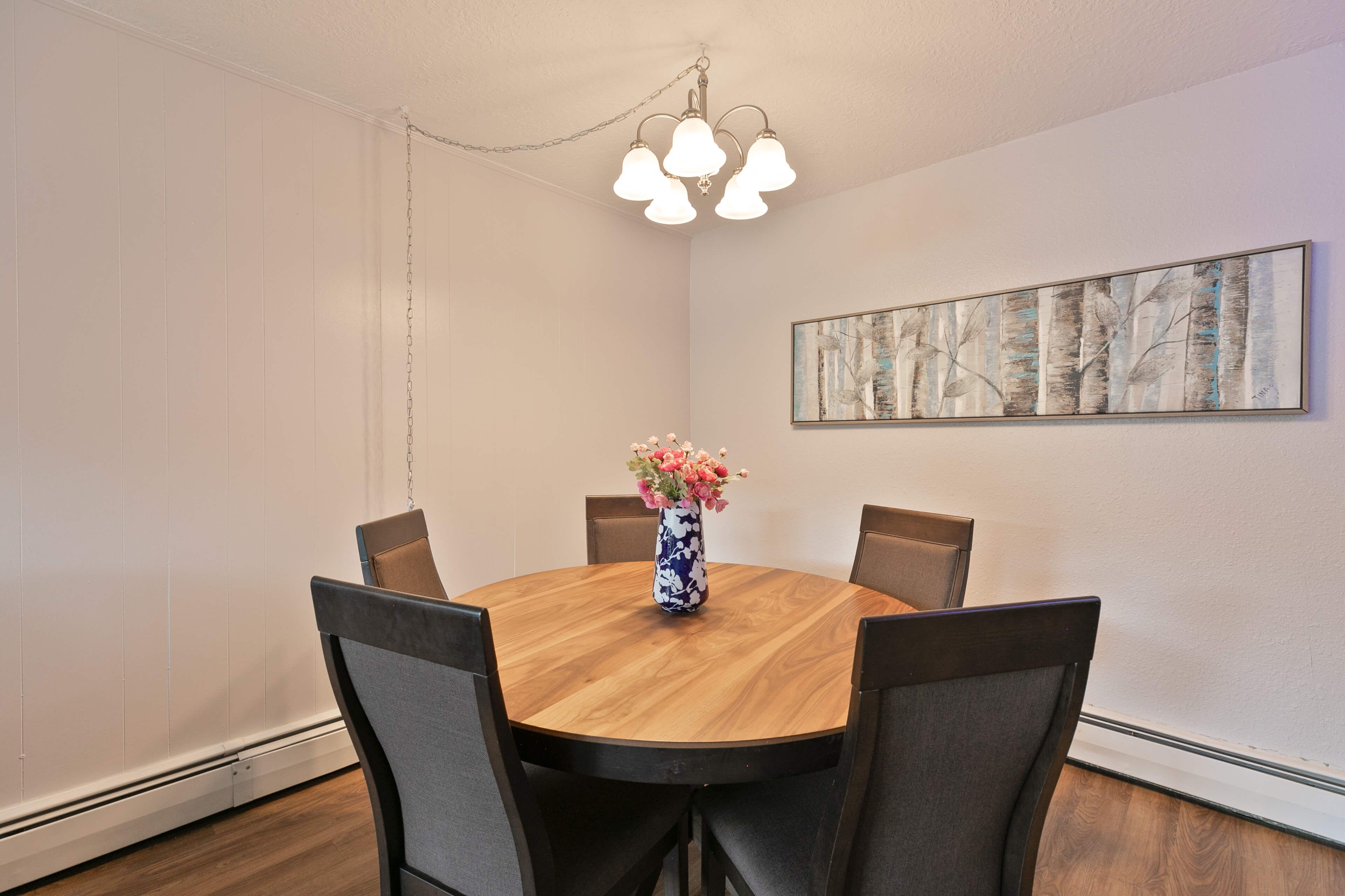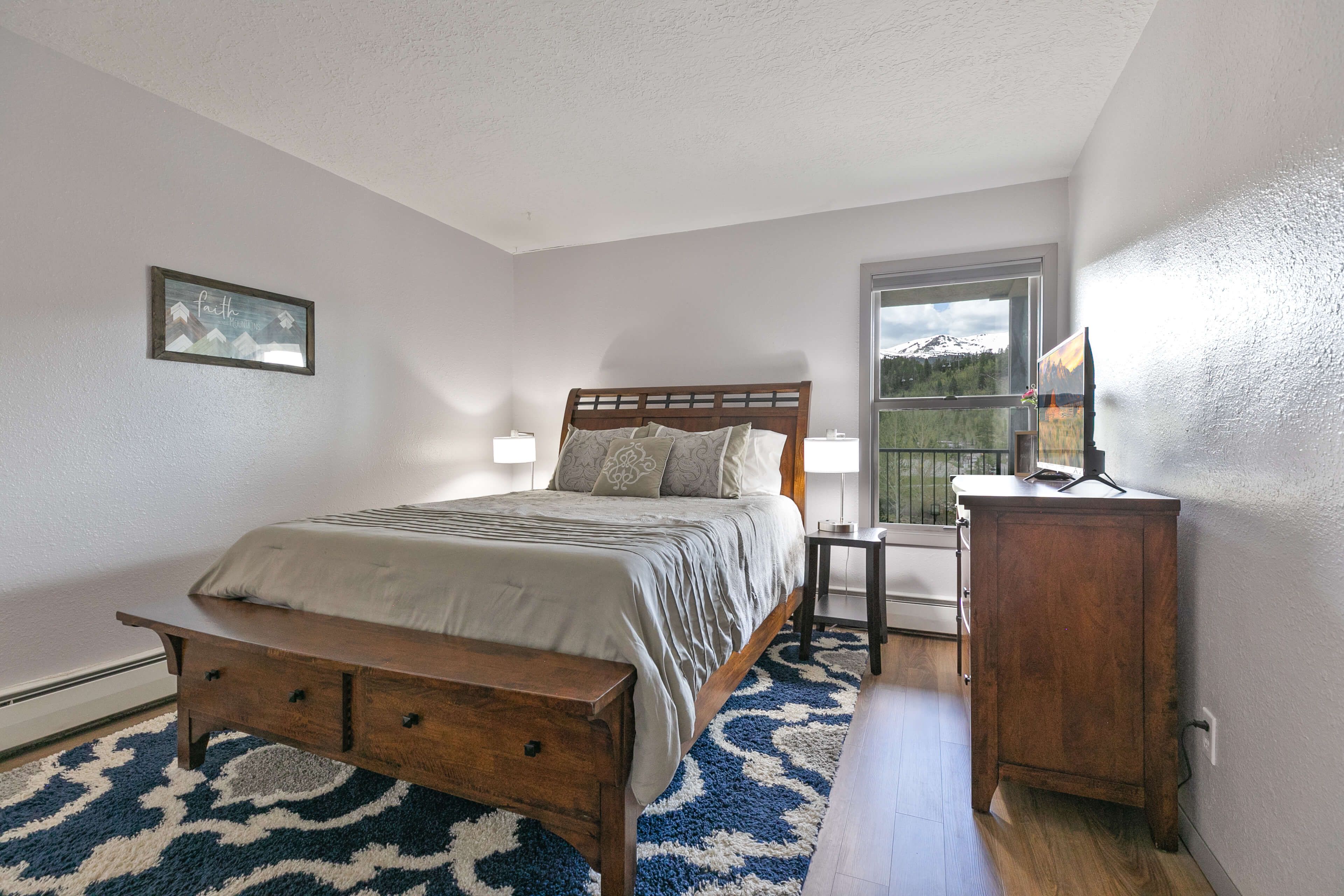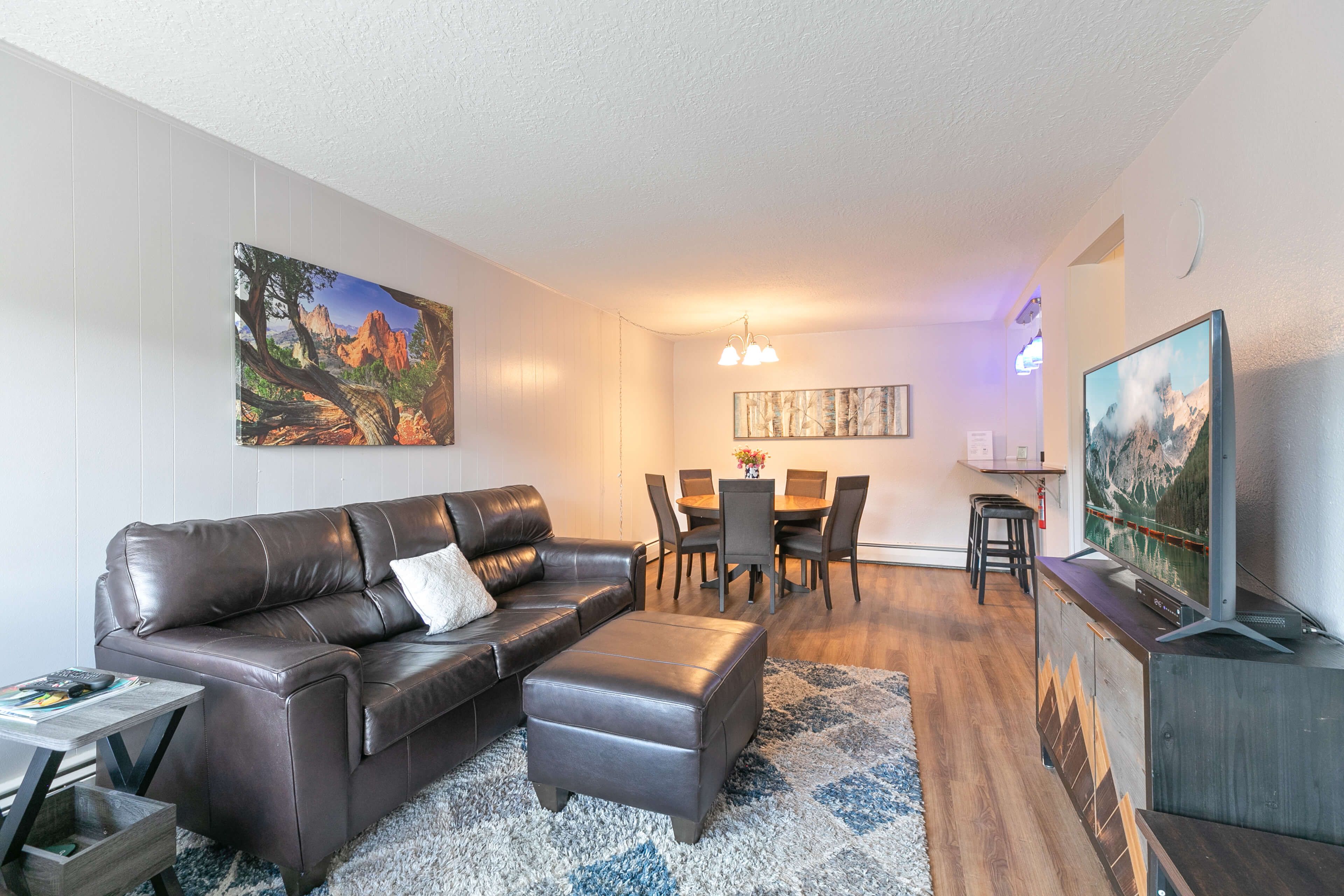Gold Creek Condo is a 2-bedroom, 2-bathroom condo that can accommodate up to 7 people. You’ll love the updated interior, excellent location, and great views! The living area is modern and chic with comfortable leather seating and a large flat-screen TV with complimentary cable so you can catch the game or watch your favorite shows. The views from the windows include Breckenridge Ski Resort and the gondola. The kitchen is just off the living area and is fully equipped with all the gear you’ll need to whip up a culinary masterpiece or a snack before hitting the slopes. The dining area is just of the kitchen with room for six at the dining room table and two more seats at the kitchen counter.