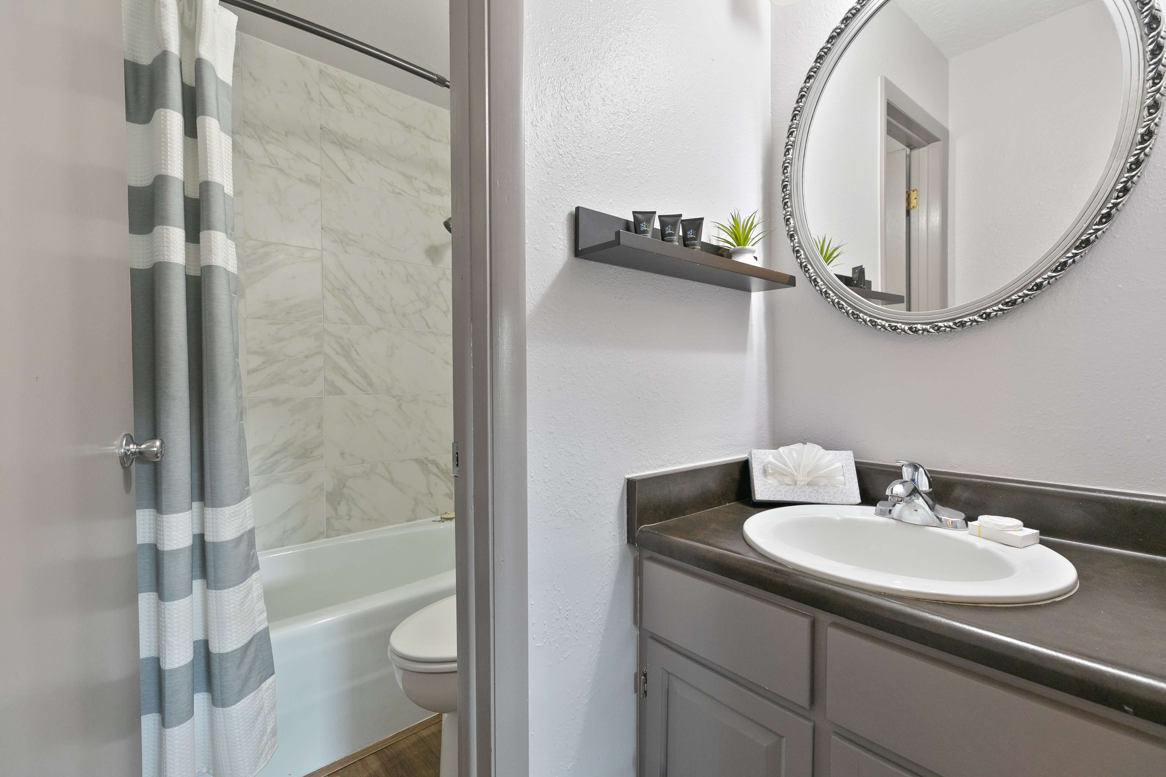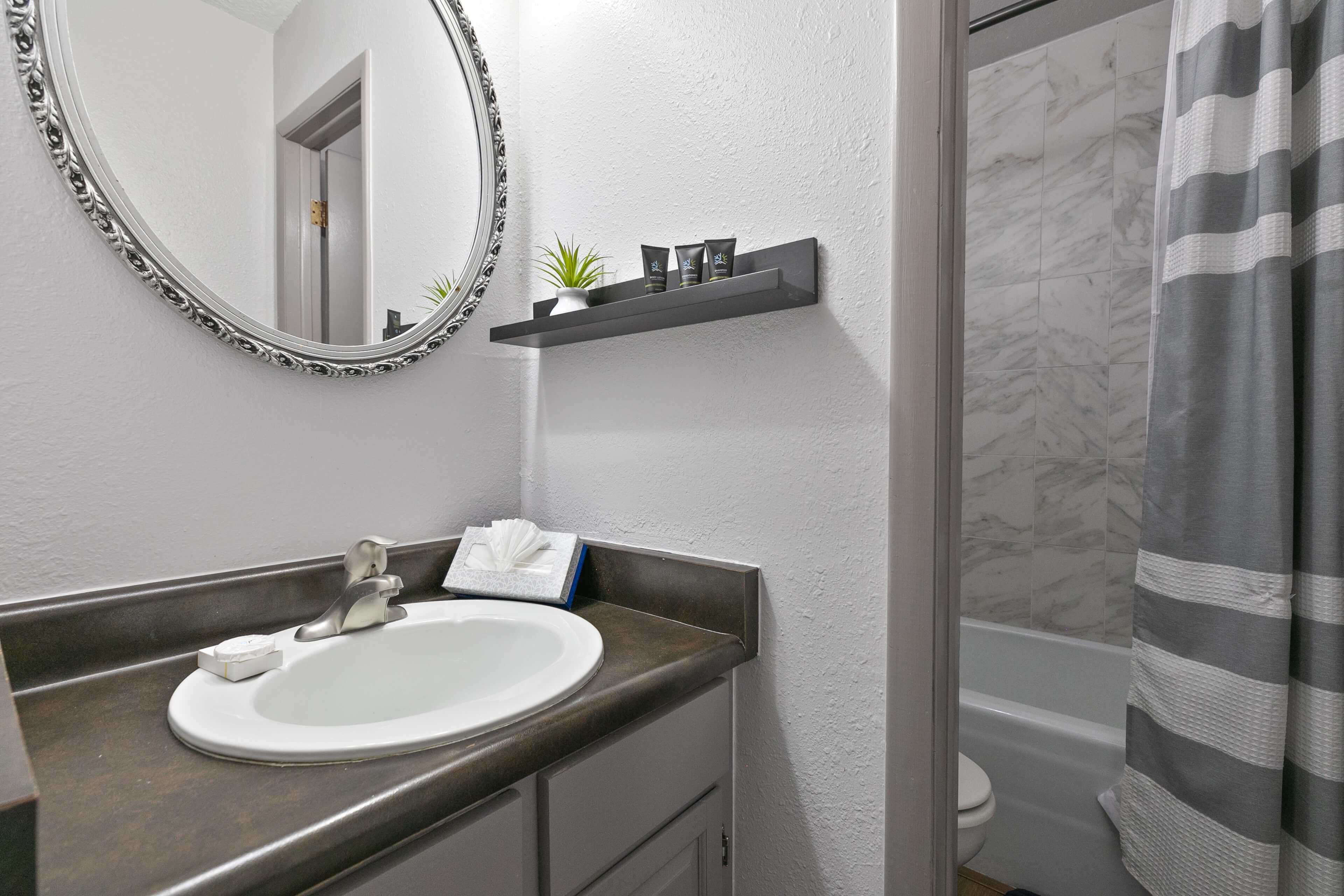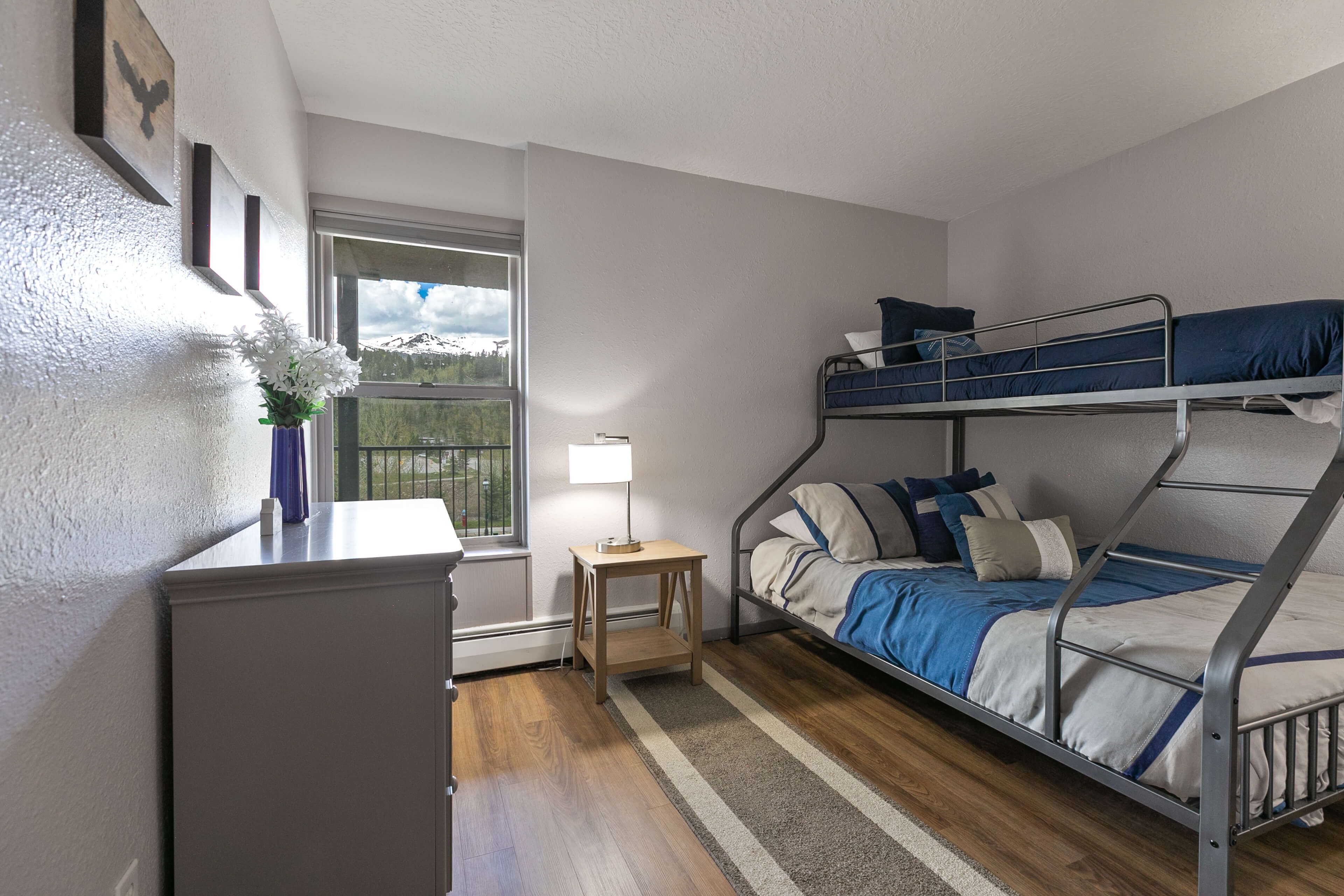 Gold Creek Condo is a 2-bedroom, 2-bathroom condo that can accommodate up to 7 people. You’ll love the updated interior, excellent location, and great views! The living area is modern and chic with comfortable leather seating and a large flat-screen TV with complimentary cable so you can catch the game or watch your favorite shows. The views from the windows include Breckenridge Ski Resort and the gondola. The kitchen is just off the living area and is fully equipped with all the gear you’ll need to whip up a culinary masterpiece or a snack before hitting the slopes. The dining area is just of the kitchen with room for six at the dining room table and two more seats at the kitchen counter.