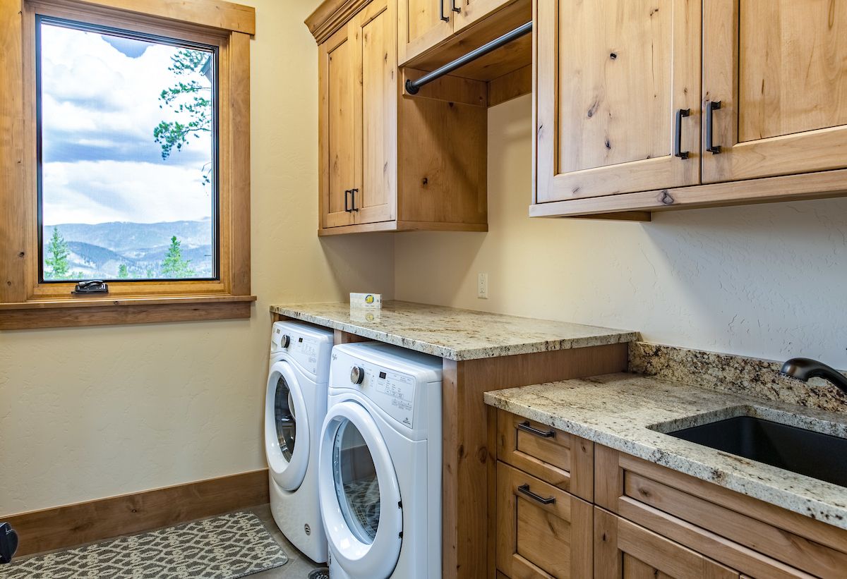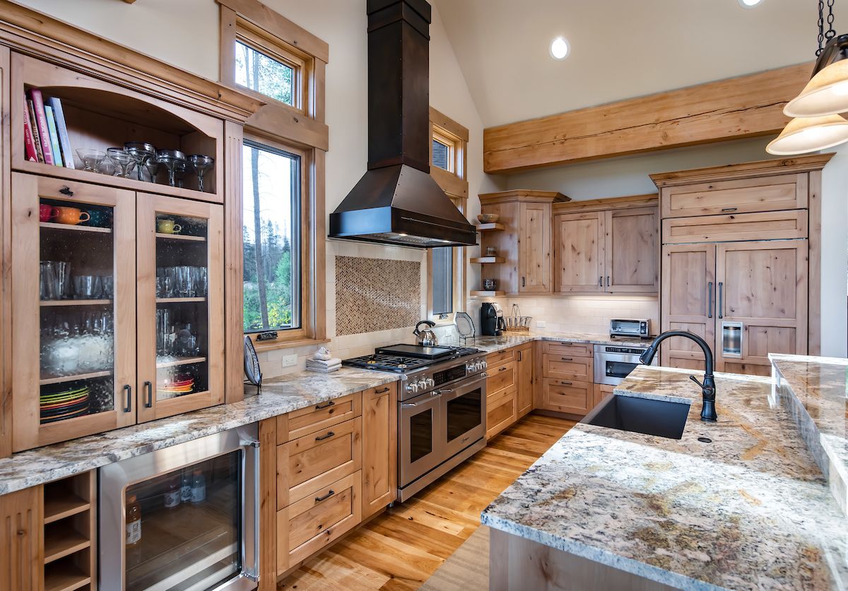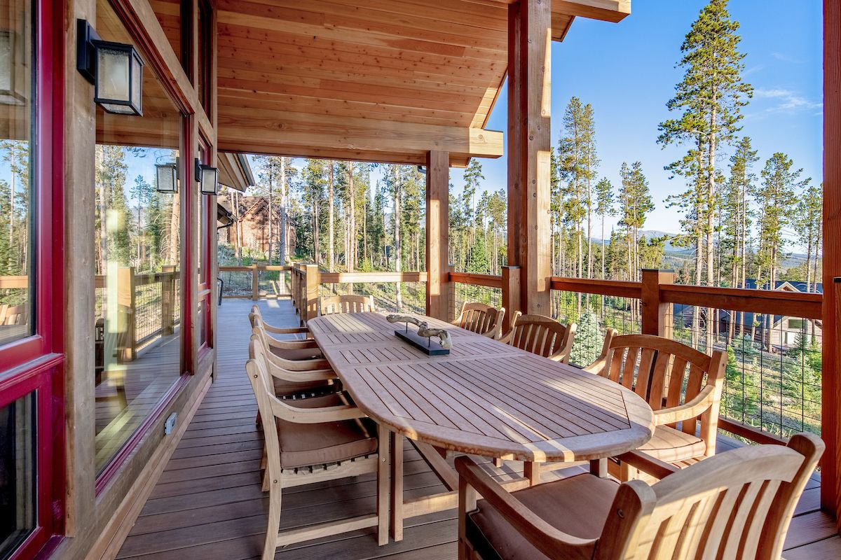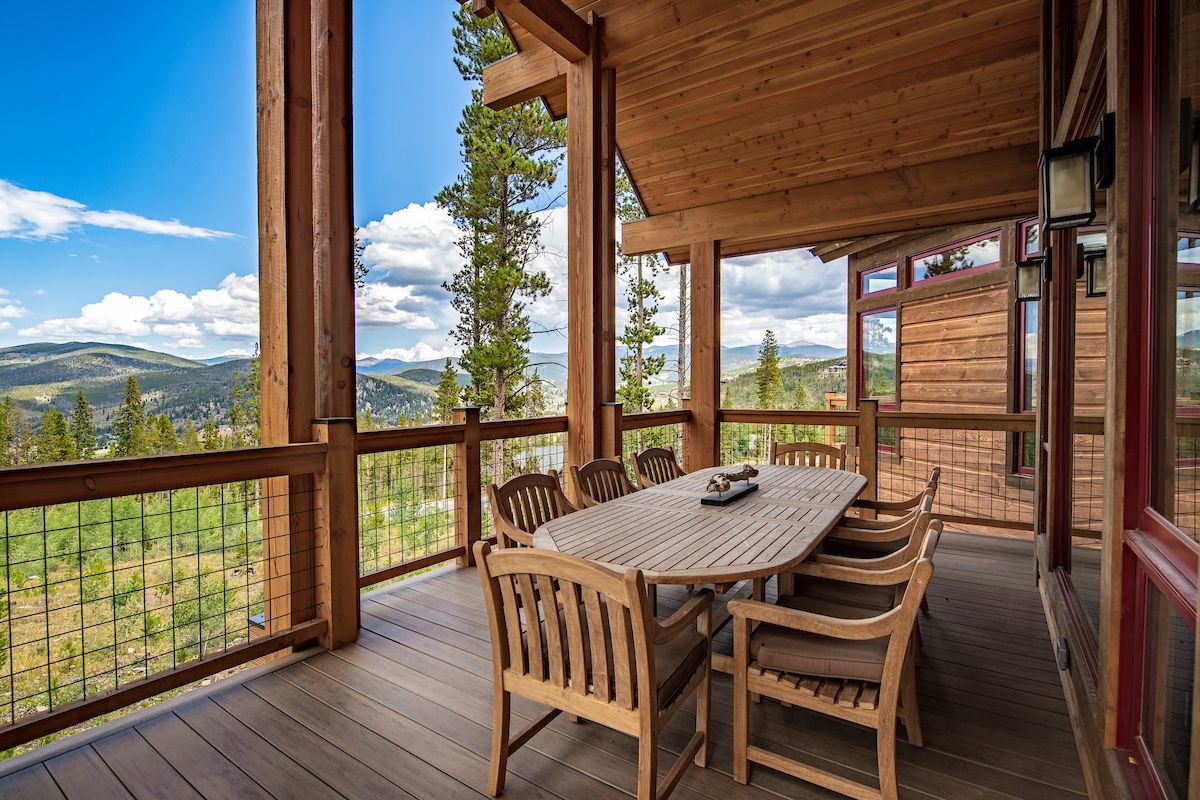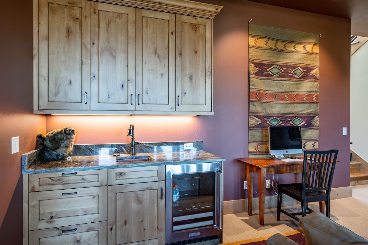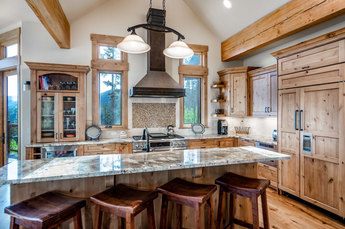 • Gourmet Kitchen and Dining Options: The beautifully designed kitchen, equipped with granite countertops and high-end stainless-steel appliances, is a chef’s dream. Enjoy meals with a view from the wraparound dining area seating eight or opt for casual gatherings at the breakfast bar seating four. Dine outdoors on the patio and let the alpenglow and mountain views spanning down valley set the perfect backdrop.
