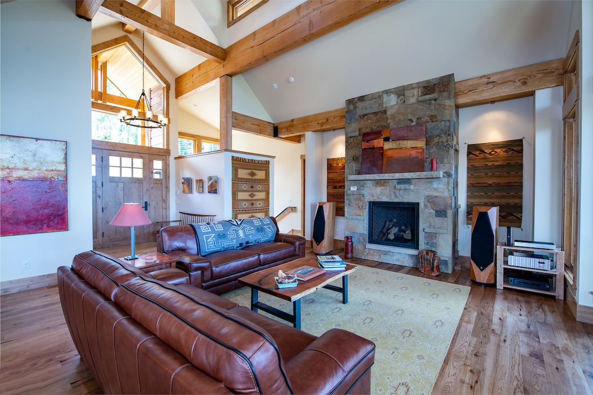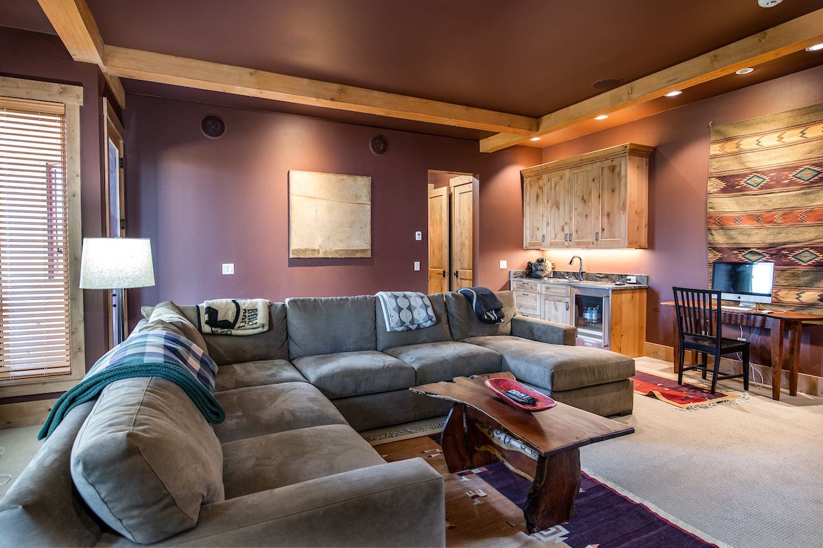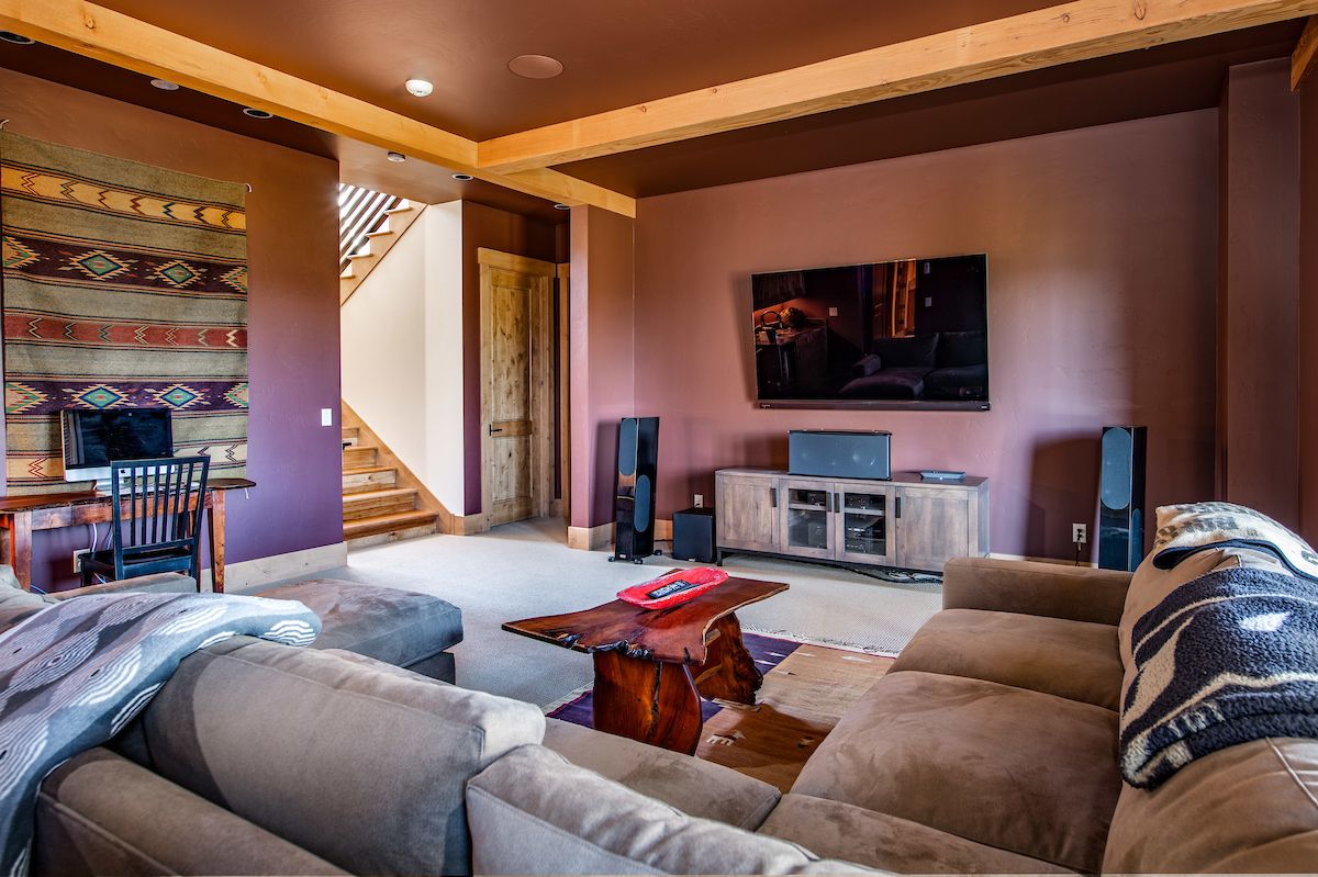 • Elegant and Expansive Living Spaces: The main living area welcomes you with vaulted ceilings, exposed log trusses, and floor-to-ceiling windows that fill the home with natural light and breathtaking vistas. A stylish gas fireplace surrounded by southwest-inspired decor and plush leather sofas offers the ideal setting to unwind after a day on the slopes. For extra entertainment, a lower-level room provides a TV, wet bar, and cozy space perfect for movies or game days.