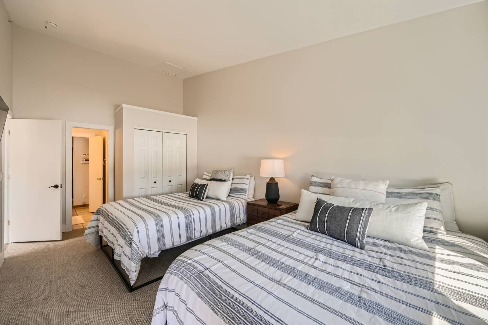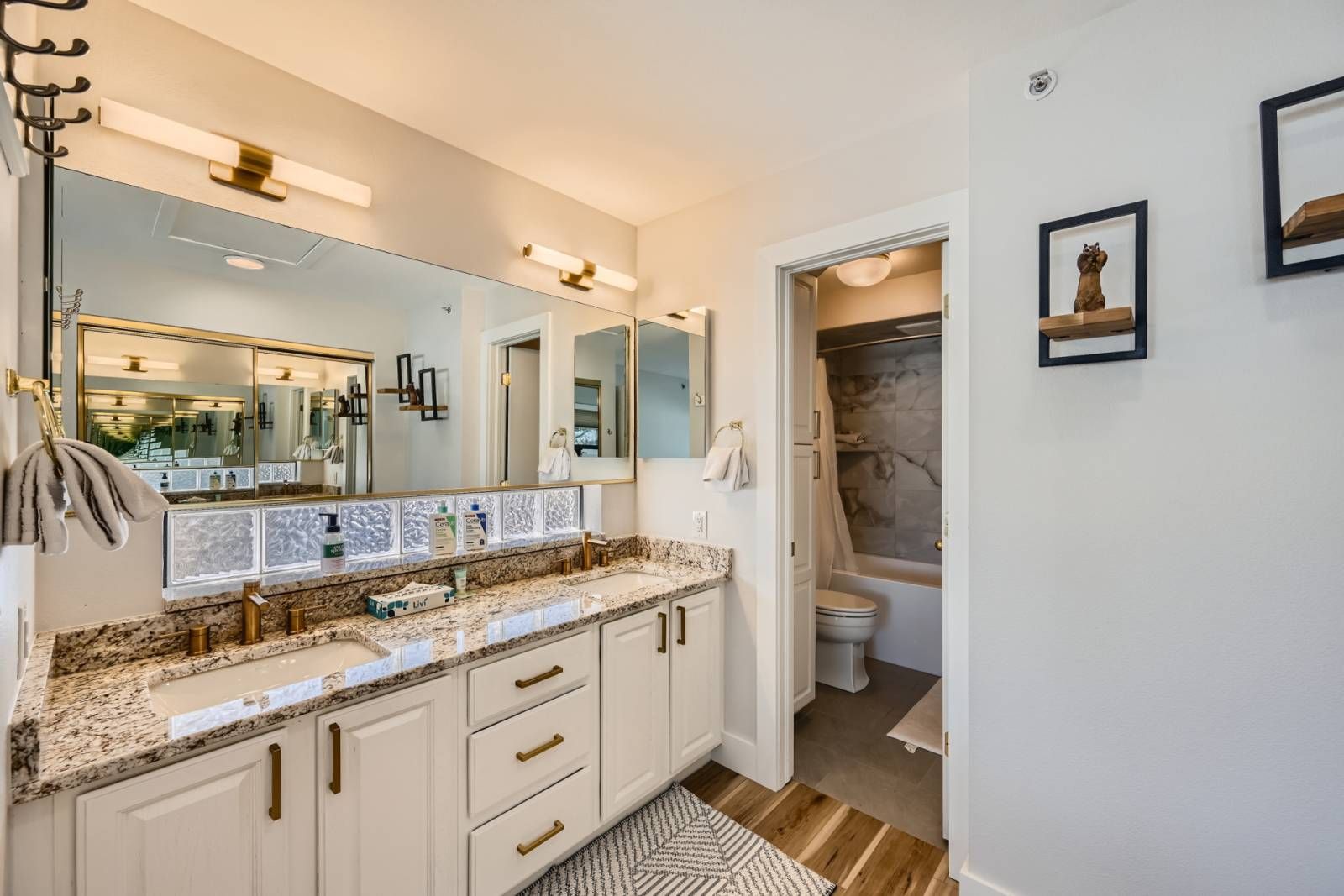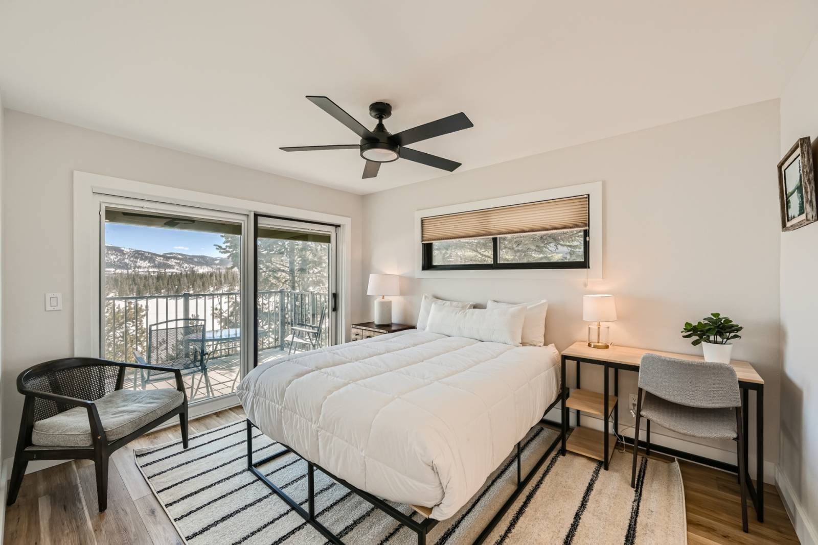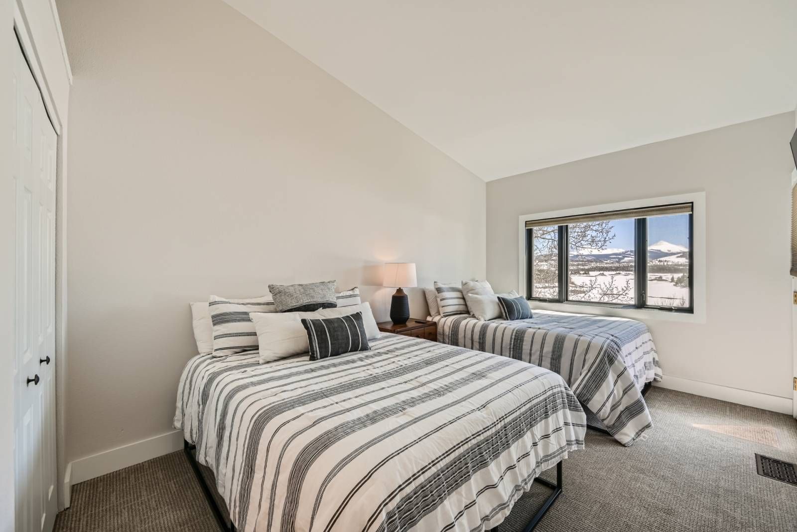 This condo is perfectly suited for families or groups, with dual master suites on the main level. One suite offers a queen bed, ensuite bathroom, direct patio access, and a dedicated desk area for remote work. The second suite includes two queen beds, patio access with lake and mountain views, and a spacious ensuite with dual vanities. Upstairs, the loft provides an additional queen bed and a third full bathroom with a walk-in tiled shower, offering both comfort and privacy for every guest.