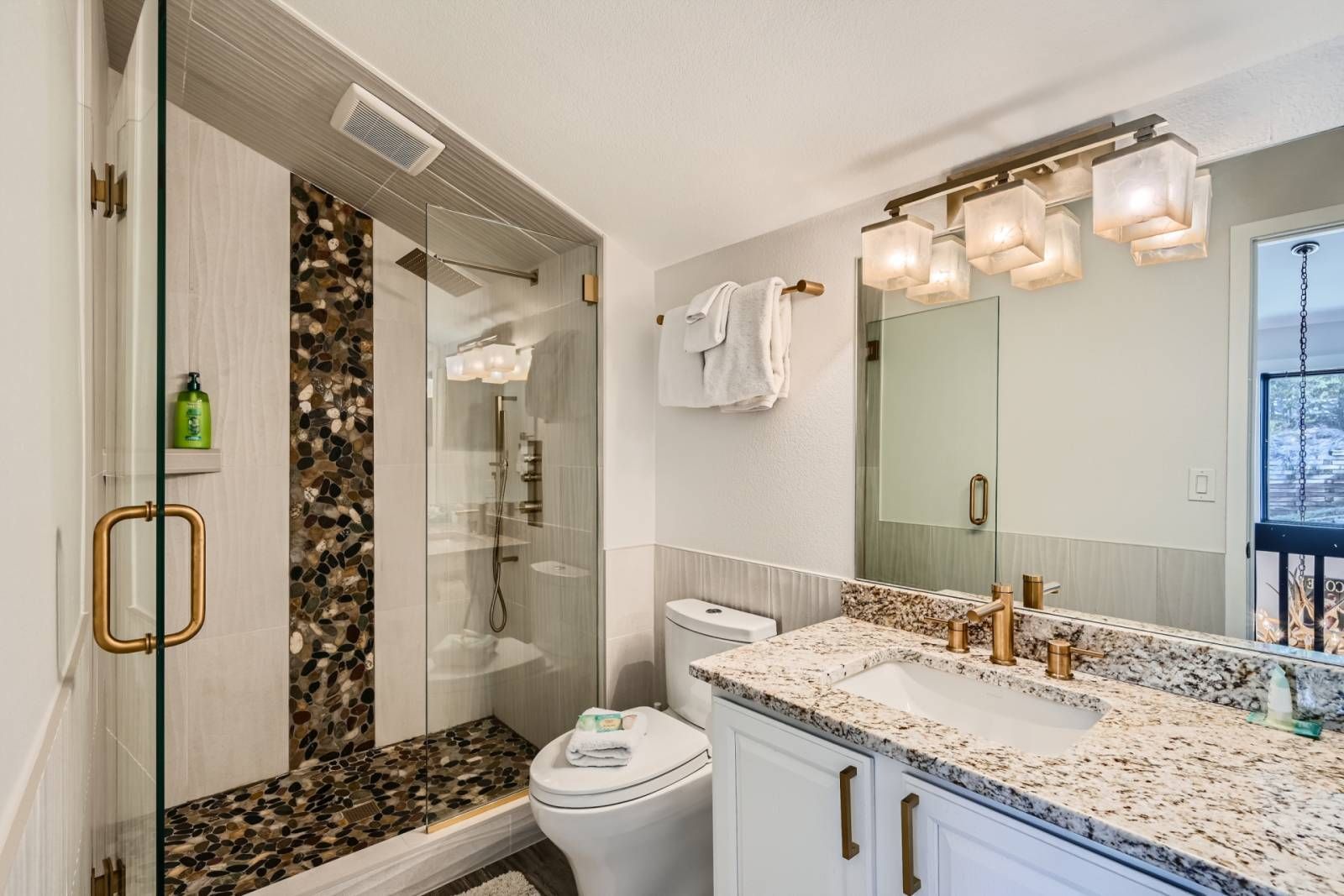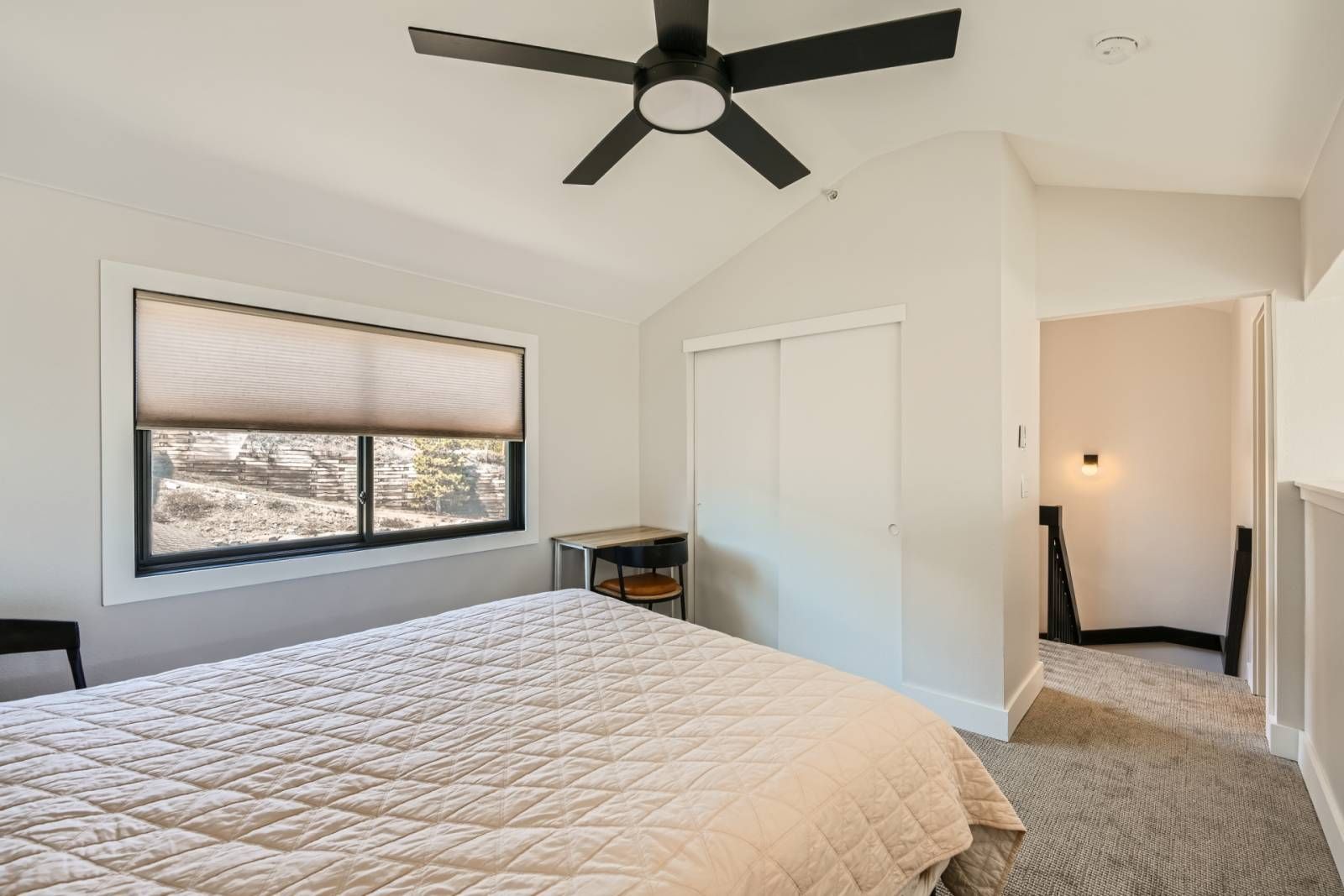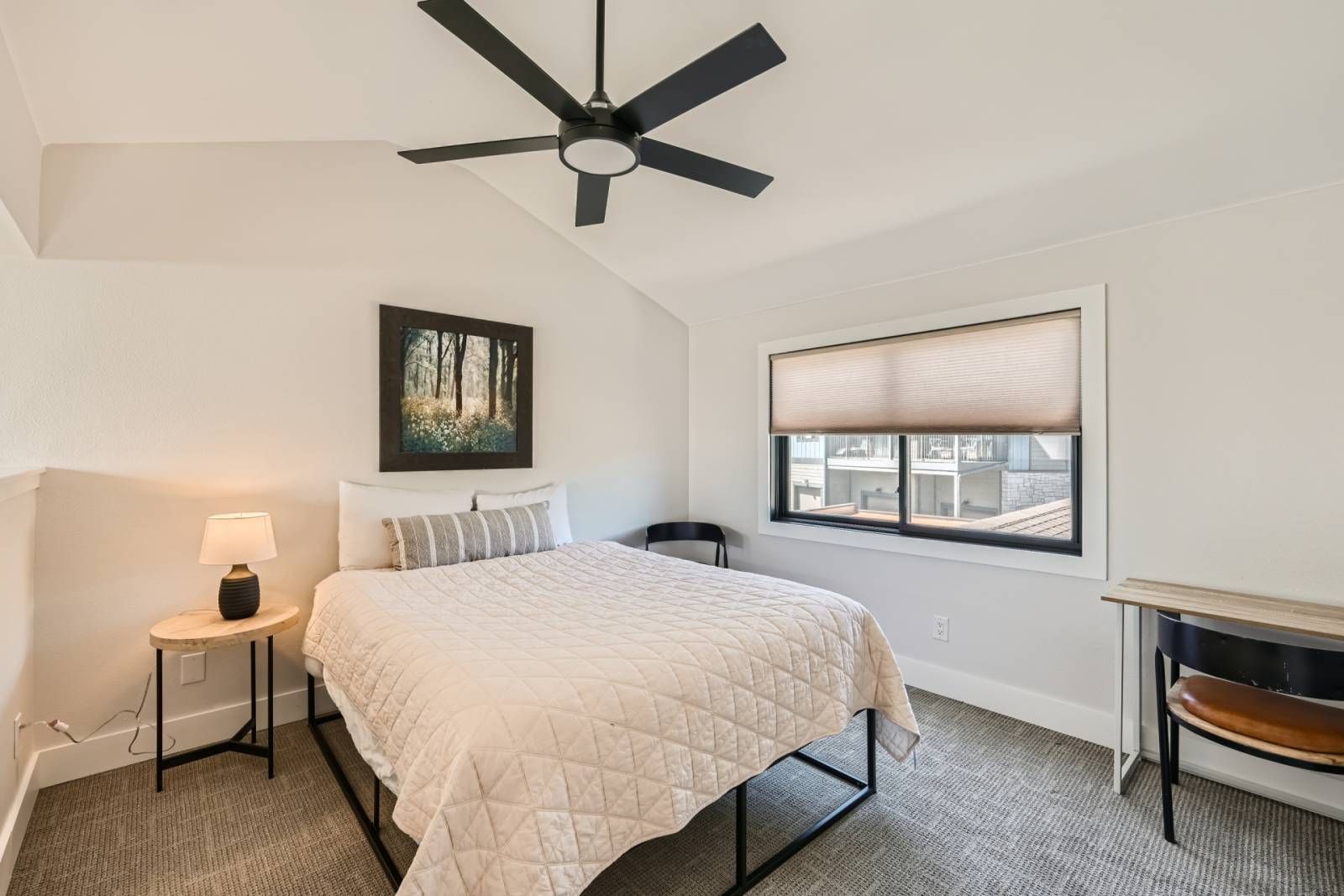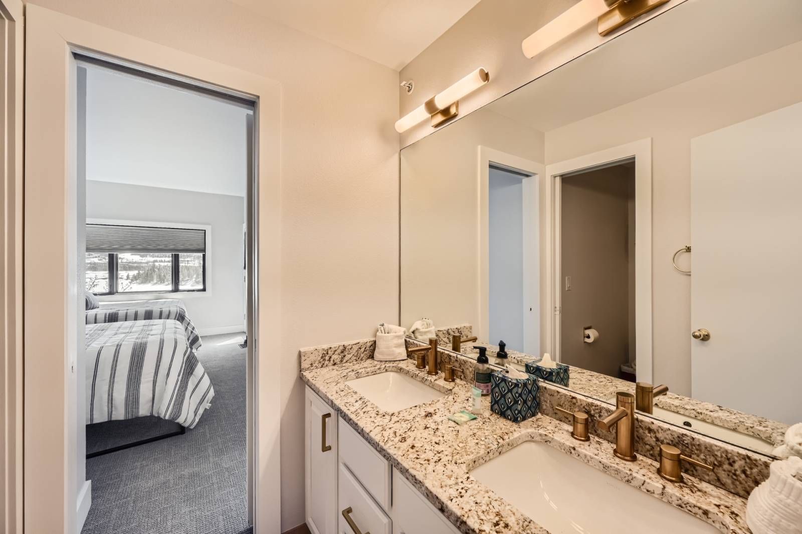 This condo is perfectly suited for families or groups, with dual master suites on the main level. One suite offers a queen bed, ensuite bathroom, direct patio access, and a dedicated desk area for remote work. The second suite includes two queen beds, patio access with lake and mountain views, and a spacious ensuite with dual vanities. Upstairs, the loft provides an additional queen bed and a third full bathroom with a walk-in tiled shower, offering both comfort and privacy for every guest.