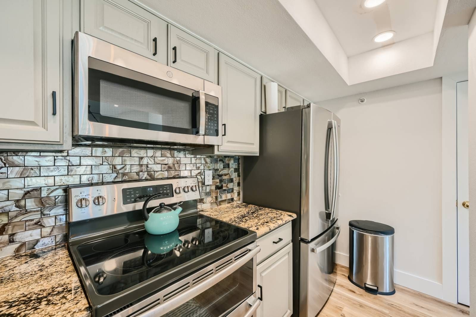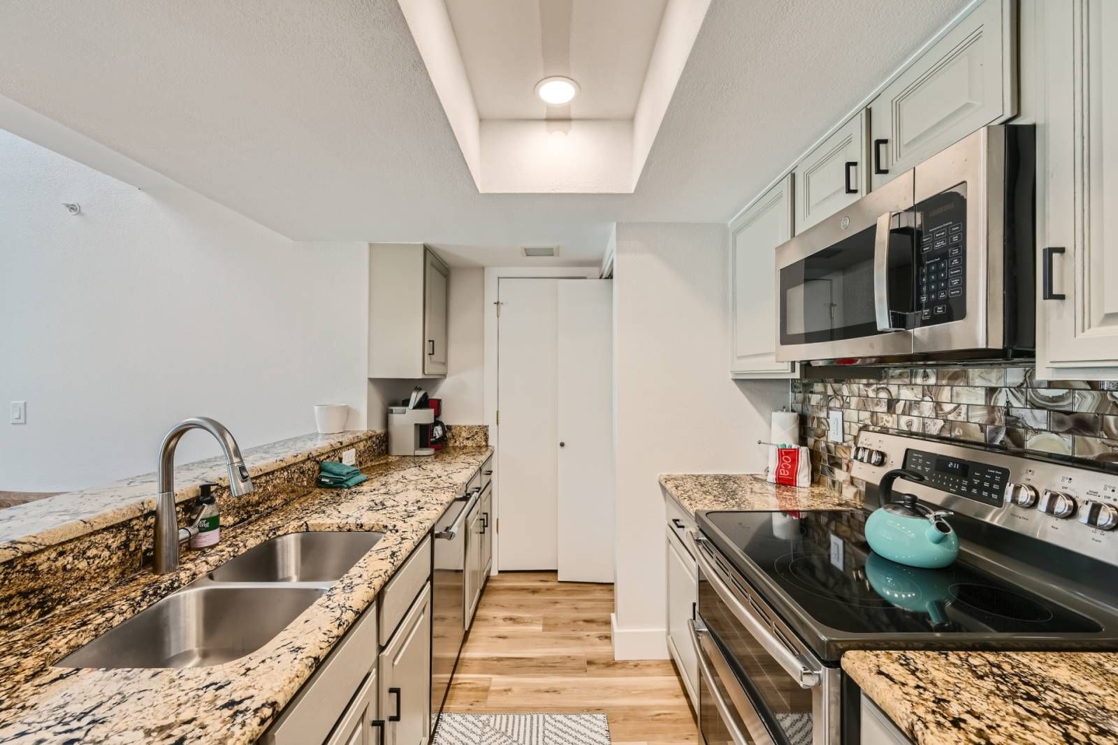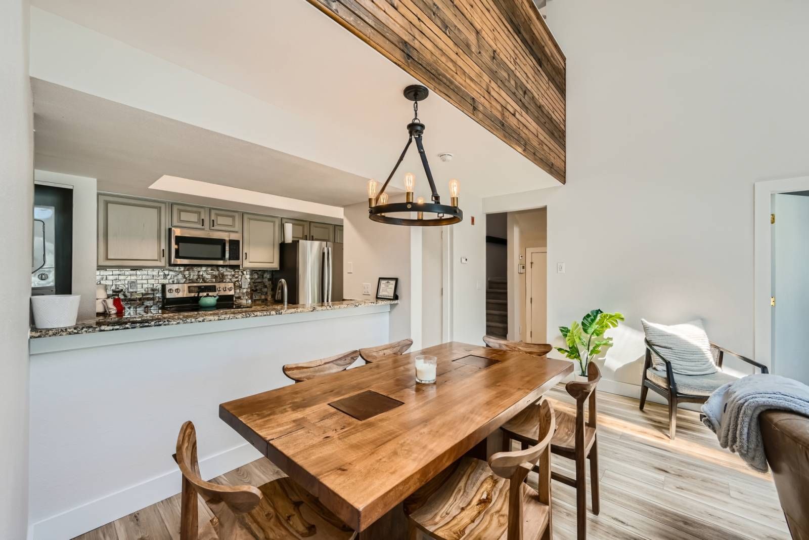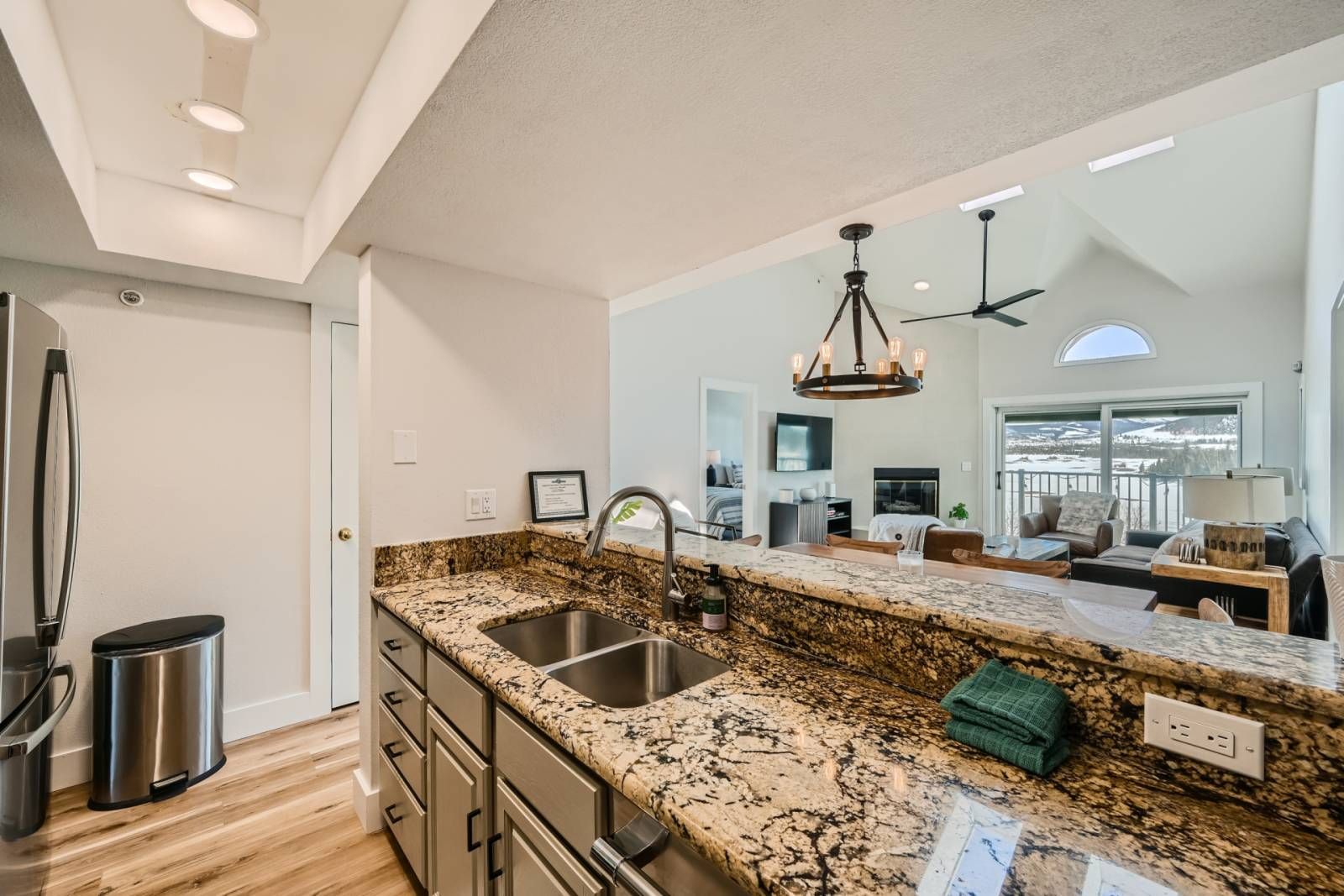 Step inside and you’ll find a bright, inviting living space with soaring ceilings and windows that flood the condo with natural light. The living room is anchored by a stone gas fireplace and features comfortable seating for gathering with family and friends after a day in the mountains. Just off the living area, the private patio provides a quiet place to take in the fresh alpine air. The kitchen has been recently updated with granite countertops, stainless-steel appliances, and all the gear you need to prepare meals, which can be enjoyed at the spacious dining table with room for everyone.