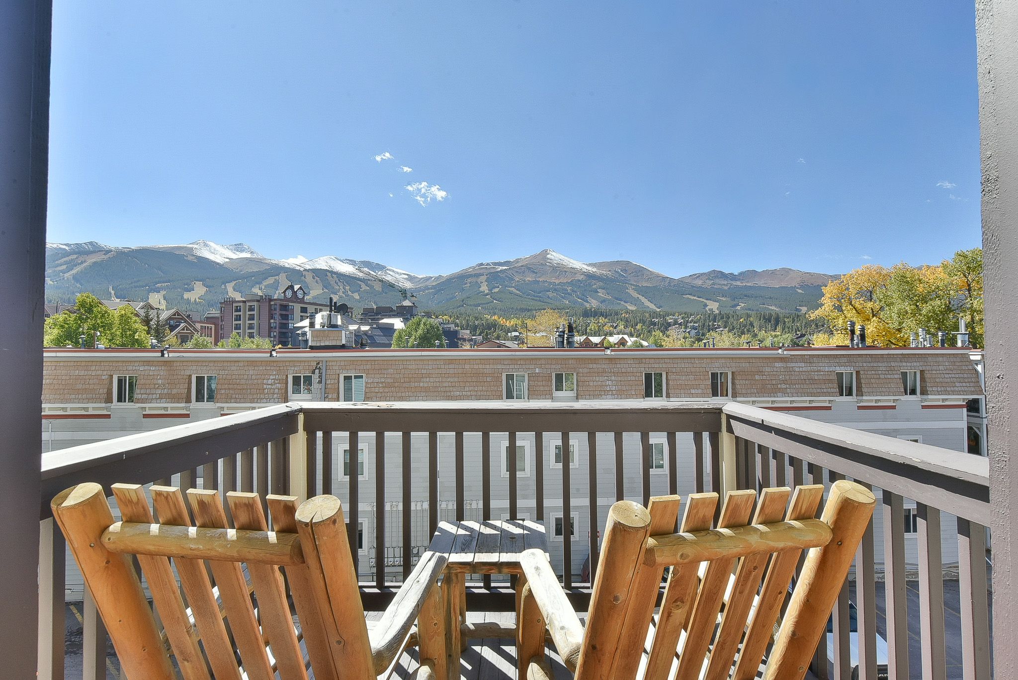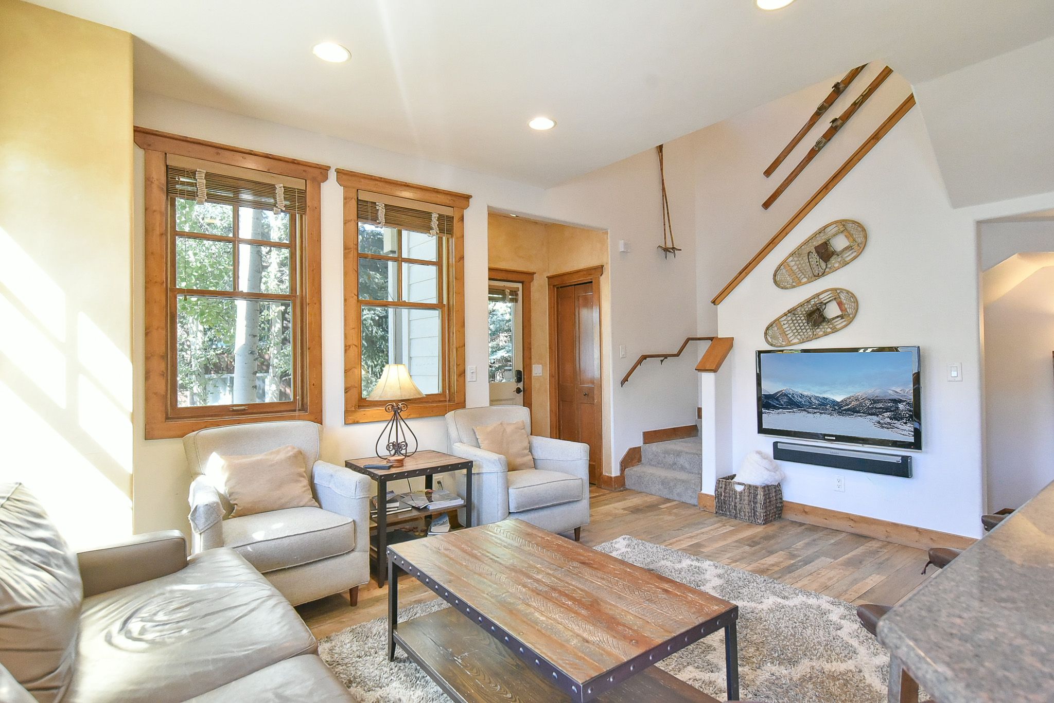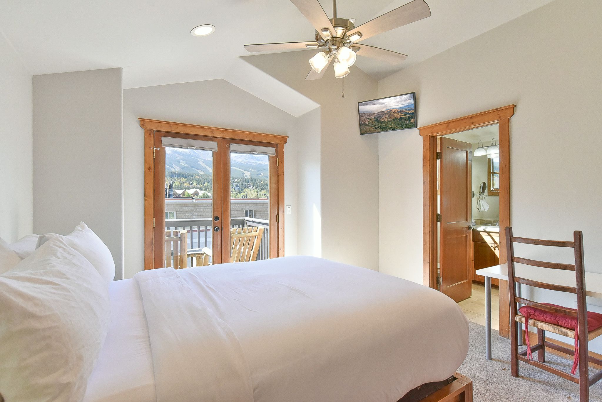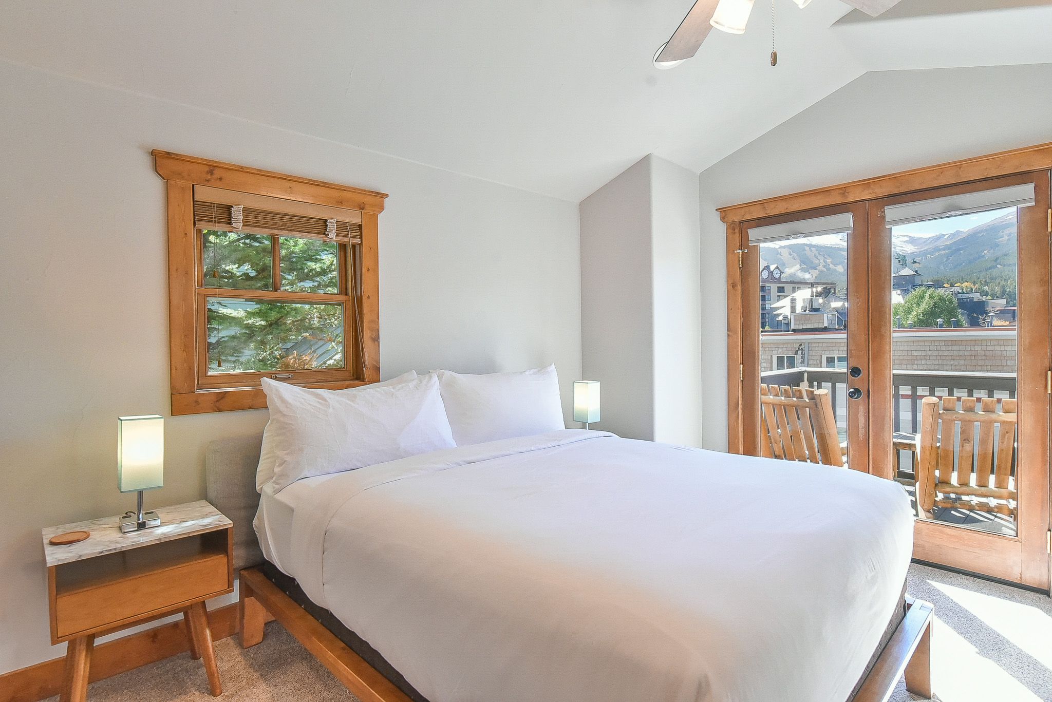 Inside, the open and airy three-level layout provides plenty of space to relax and unwind. The main living area features a gourmet kitchen with granite countertops, stainless steel appliances, and a breakfast bar—perfect for entertaining. Upstairs, the master bedroom boasts vaulted ceilings and a private balcony with sweeping views of Breckenridge Ski Resort, offering a peaceful retreat after a day of adventure.