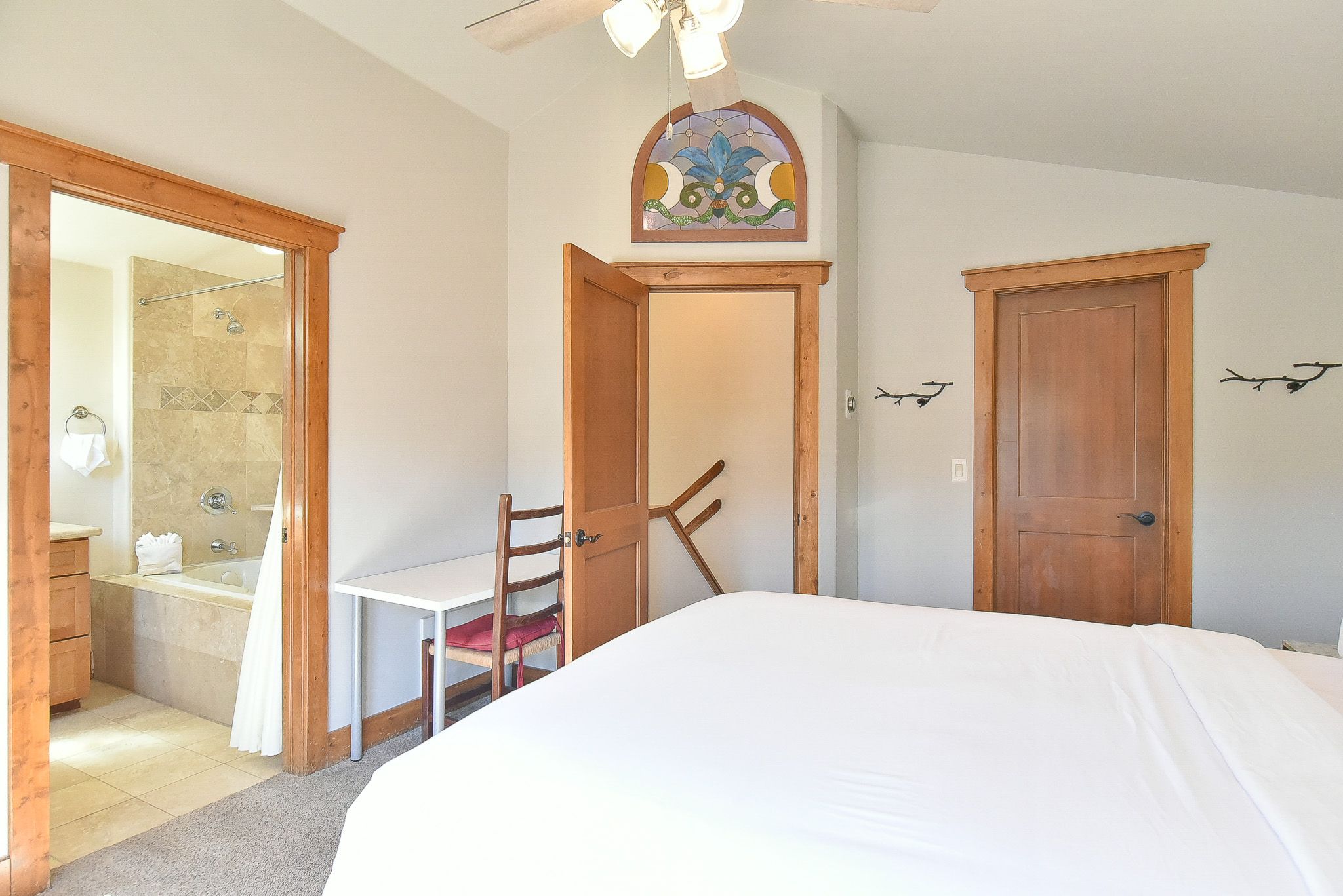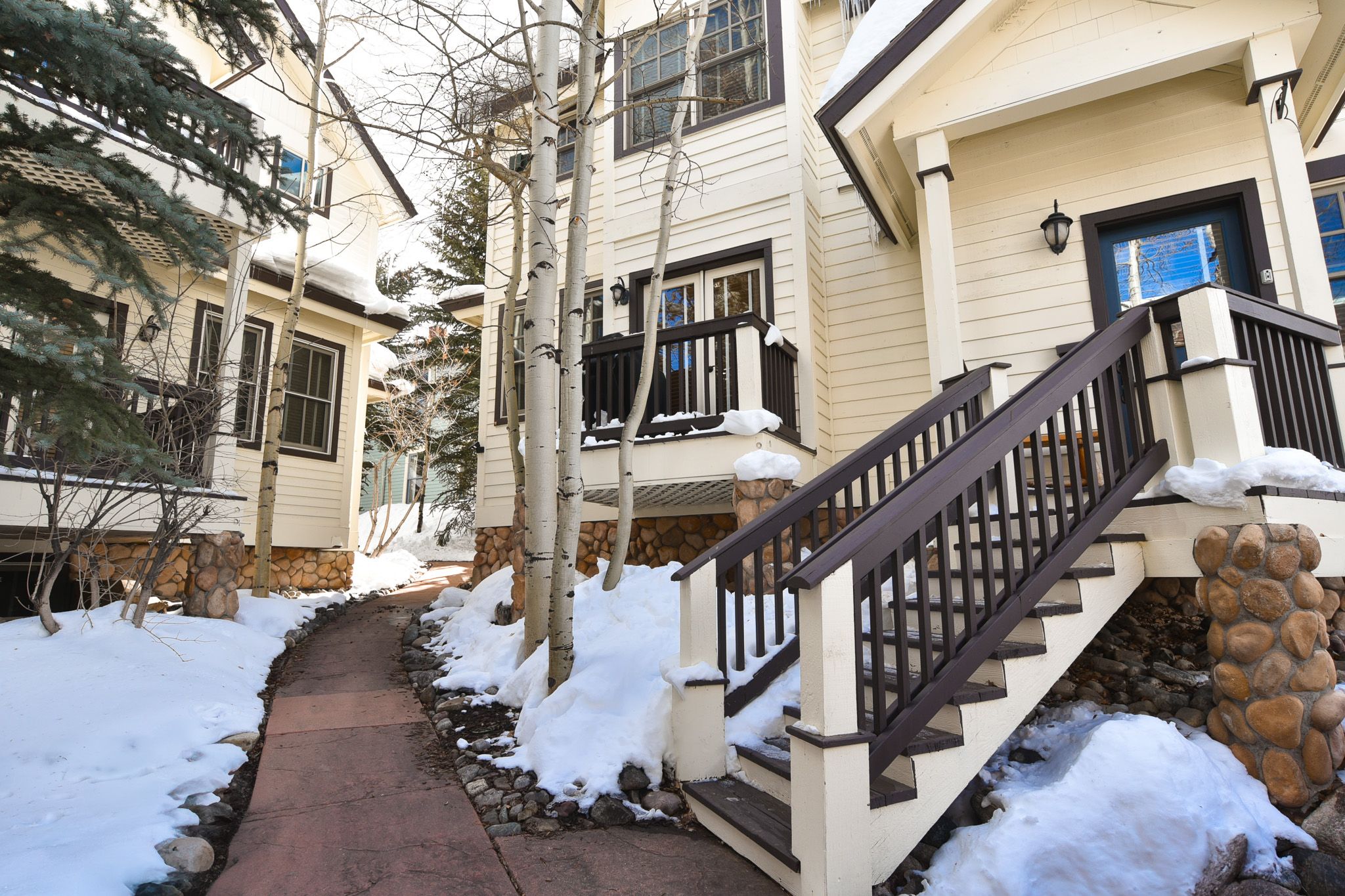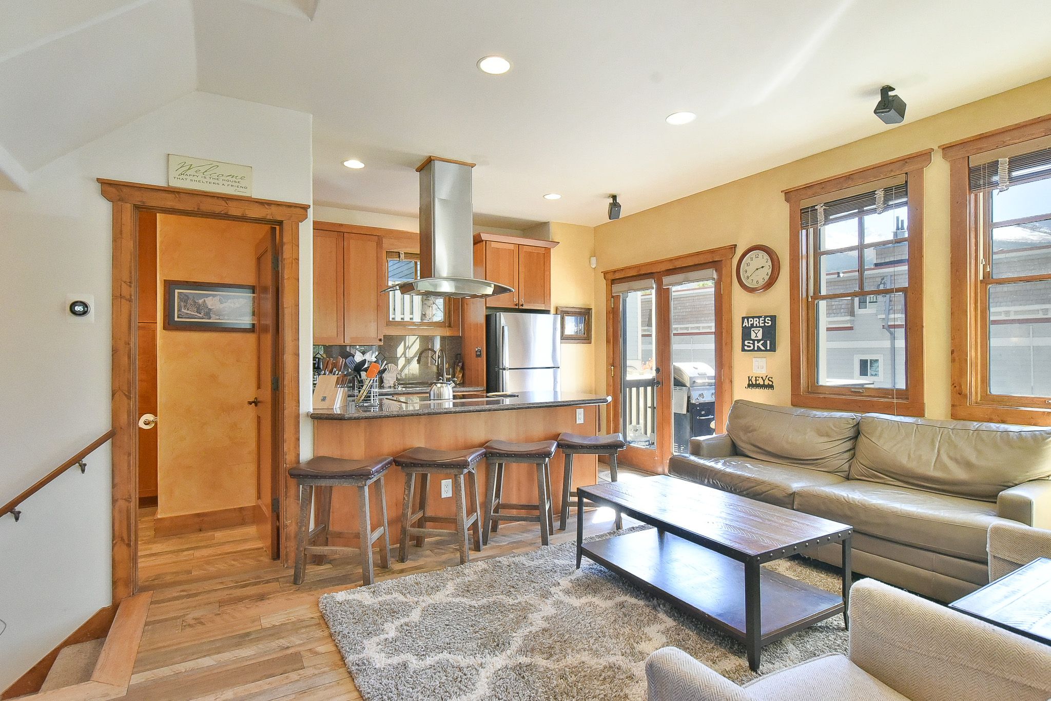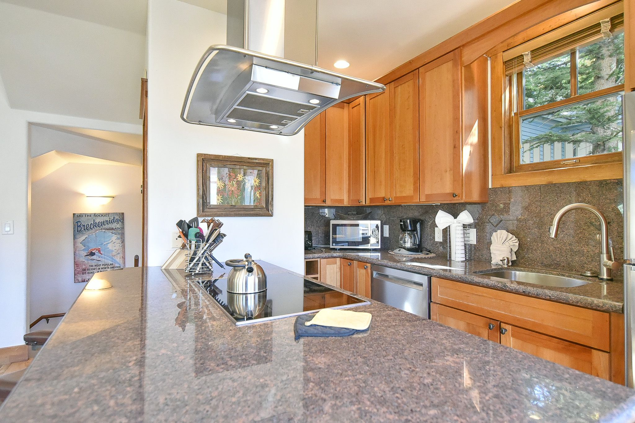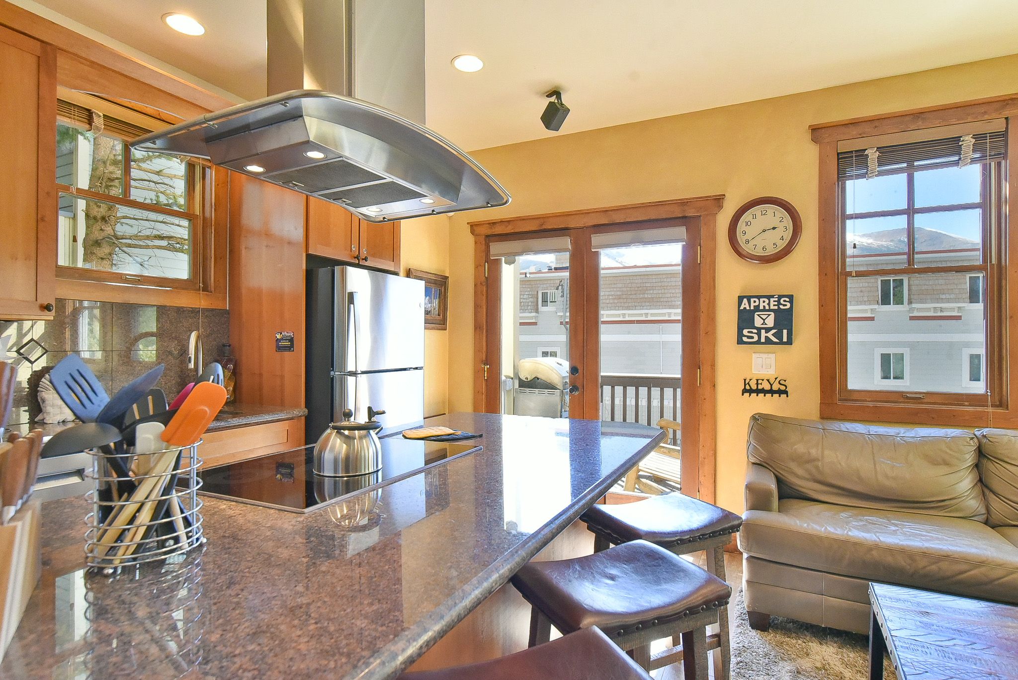Inside, the open and airy three-level layout provides plenty of space to relax and unwind. The main living area features a gourmet kitchen with granite countertops, stainless steel appliances, and a breakfast bar—perfect for entertaining. Upstairs, the master bedroom boasts vaulted ceilings and a private balcony with sweeping views of Breckenridge Ski Resort, offering a peaceful retreat after a day of adventure.
