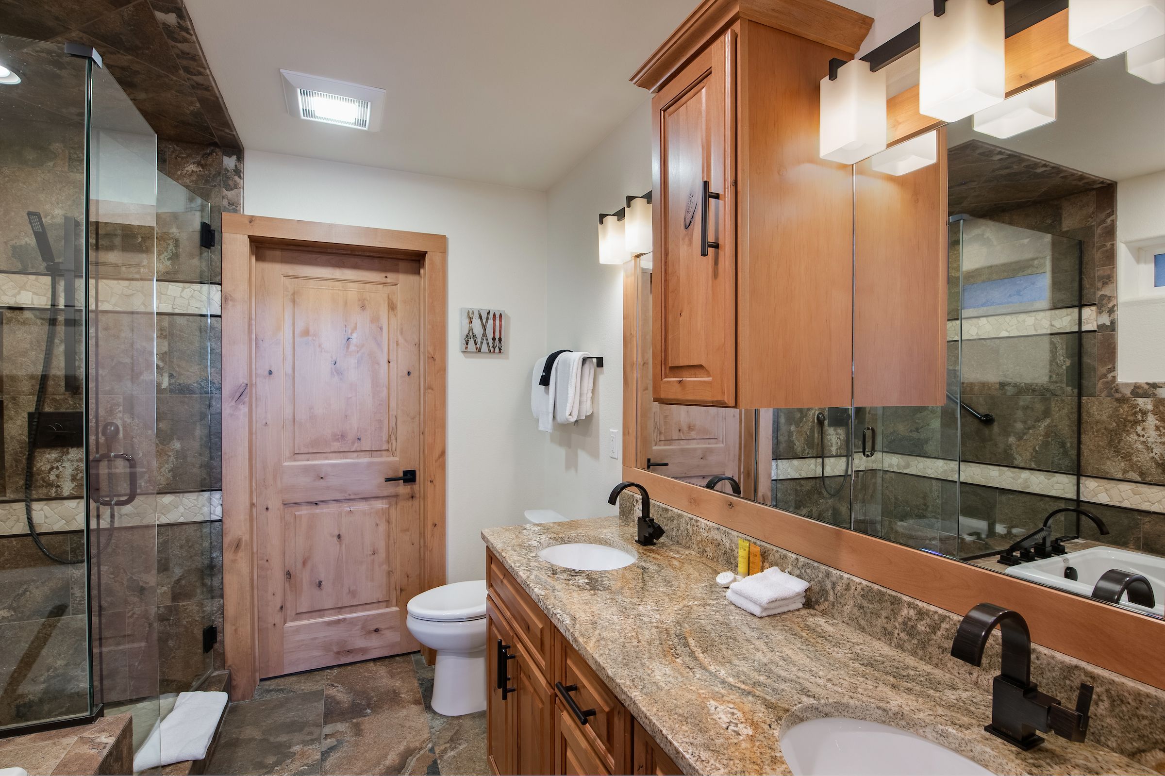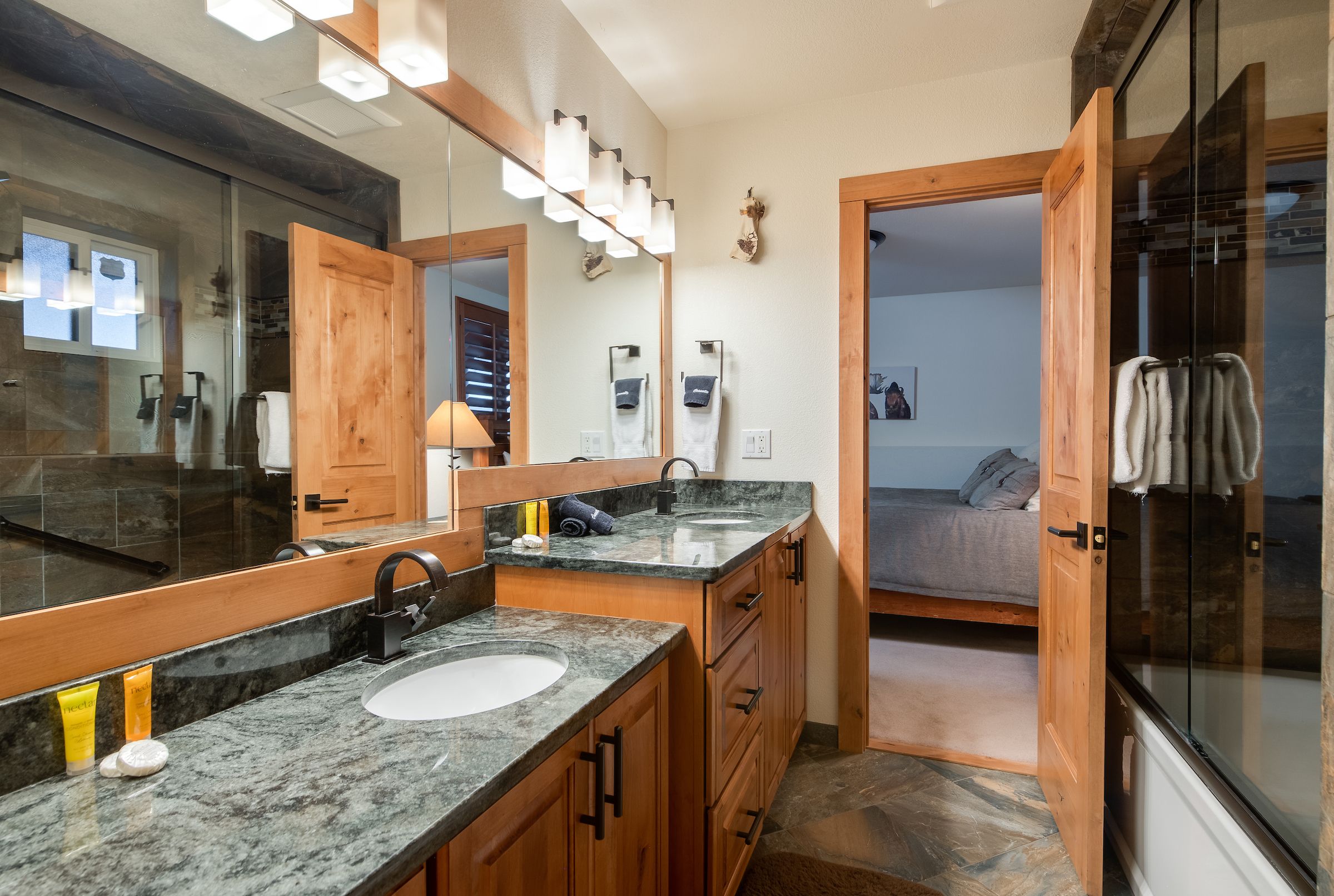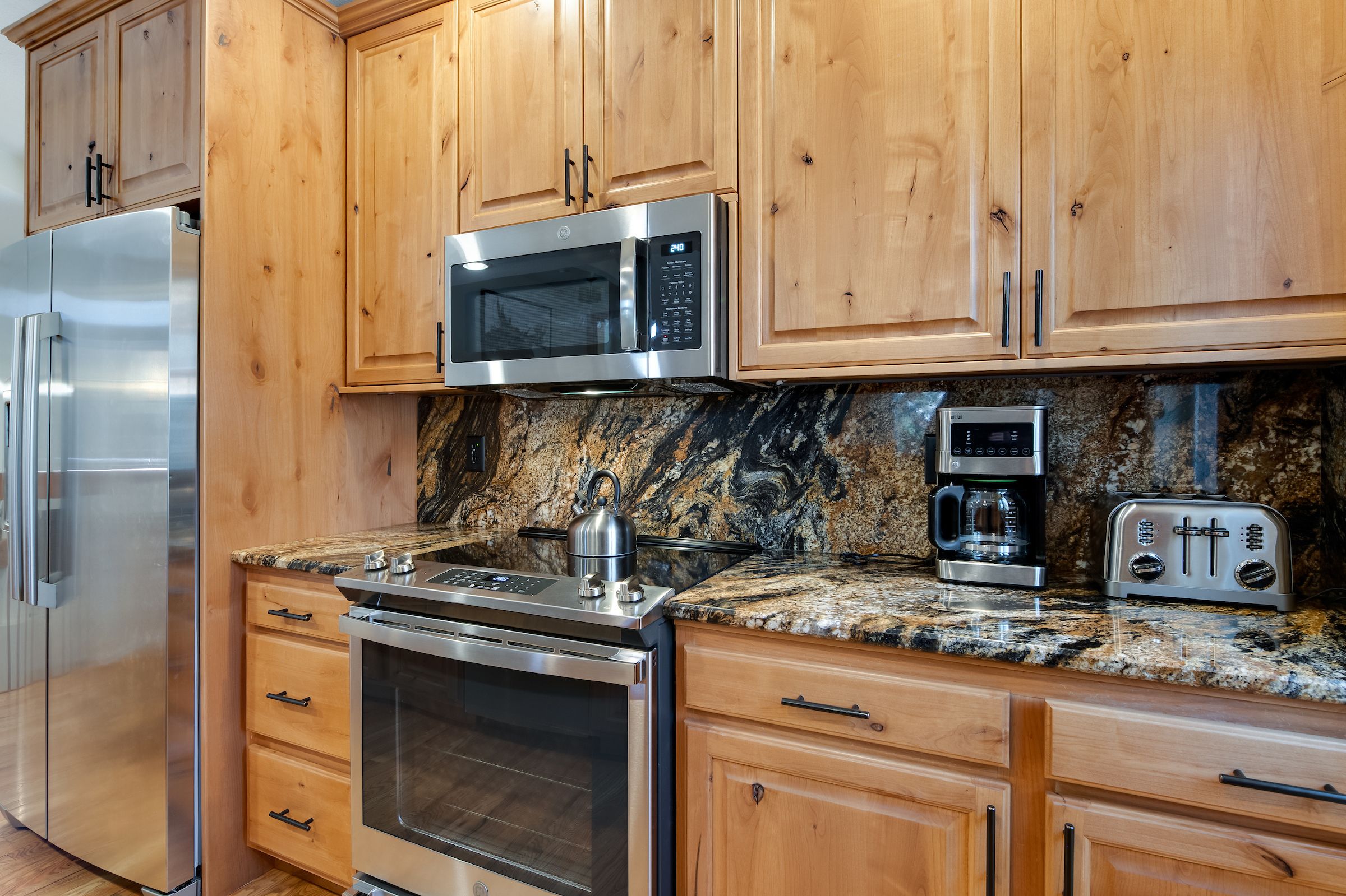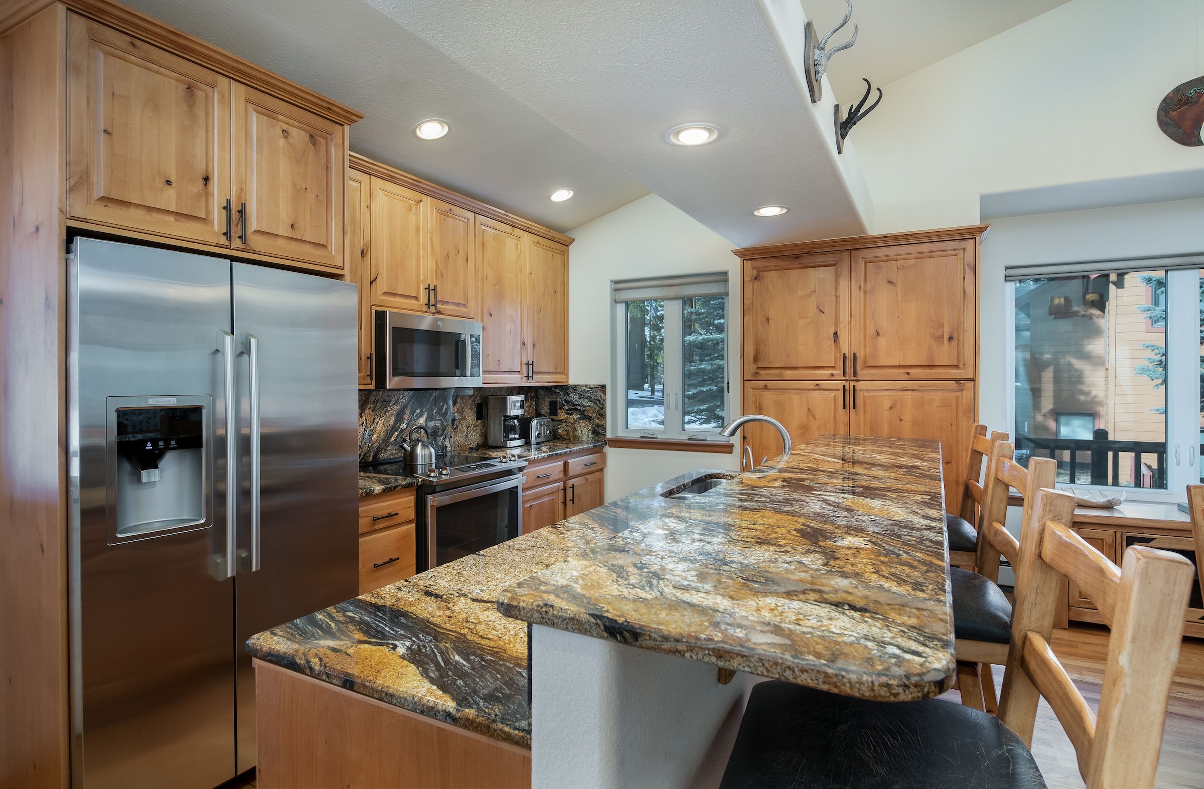 The upstairs living room is open and sunny with vaulted ceilings, luxurious leather seating, and a flat-screen Smart TV, a perfect place to relax and unwind of an adventure filled day. The fully equipped and well-stocked kitchen gives you and your group the prefect place to whip up a fantastic mountain meal, featuring spectacular granite counters, stainless-steel appliances, a breakfast bar with seating for three and a dinning table with seating for eight. An additional family room is a few steps down featuring an additional flat-screen Smart TV, gas fireplace and queen sleeper sofa.