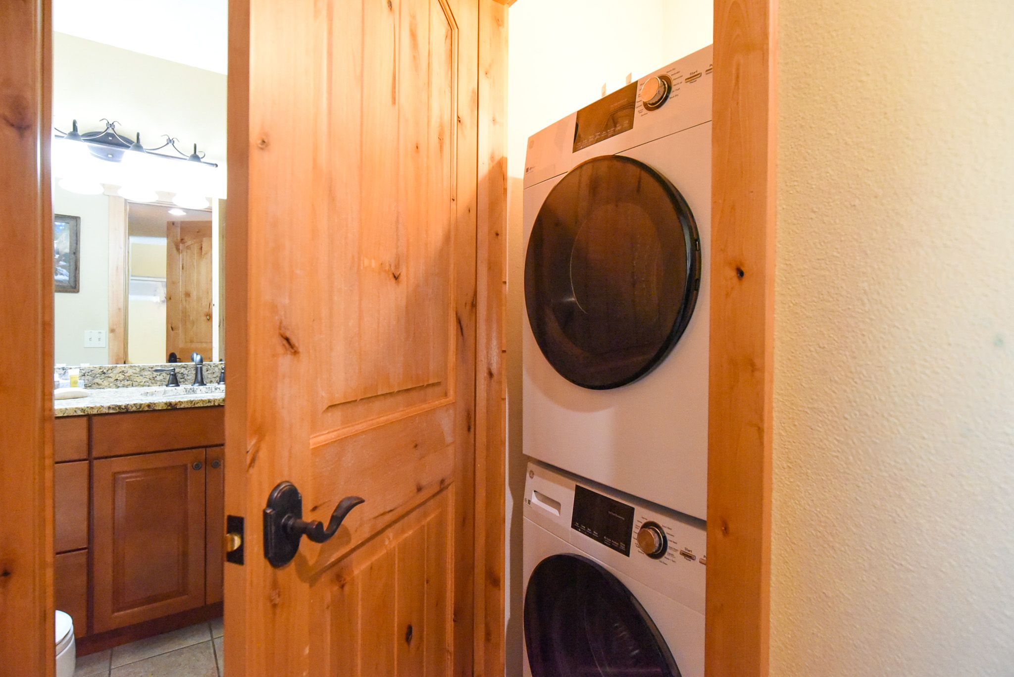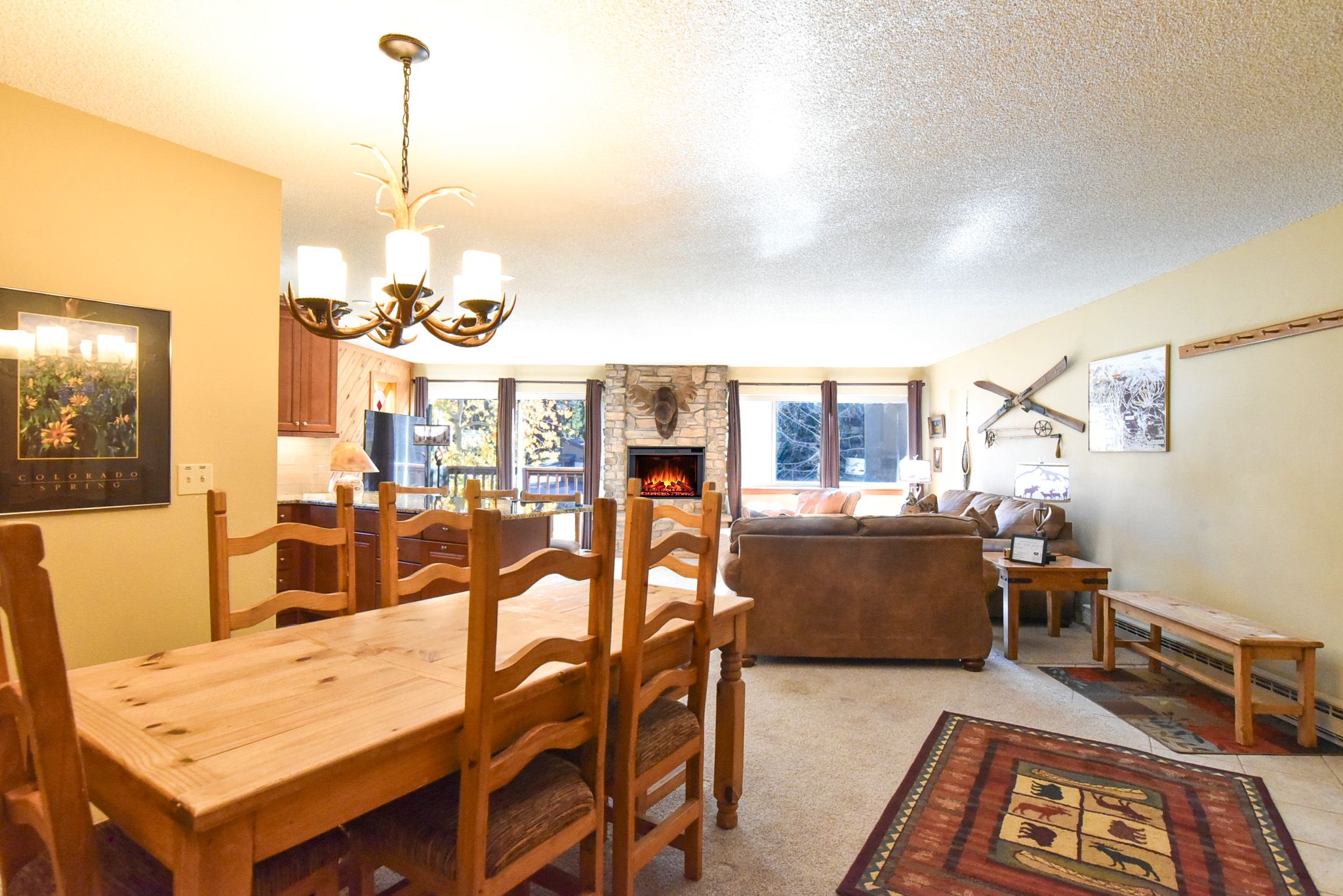 Inside, the condo captures that warm alpine feel while offering modern comfort throughout. The open-concept living area features a gas fireplace, a comfortable sofa (that doubles as a sleeper), and access to a private patio surrounded by fresh mountain air. It’s an inviting space to relax and reconnect after a day outdoors. The updated kitchen features granite countertops and stainless steel appliances, fully equipped for everything from easy breakfasts before hitting the slopes to shared evening meals with family and friends.