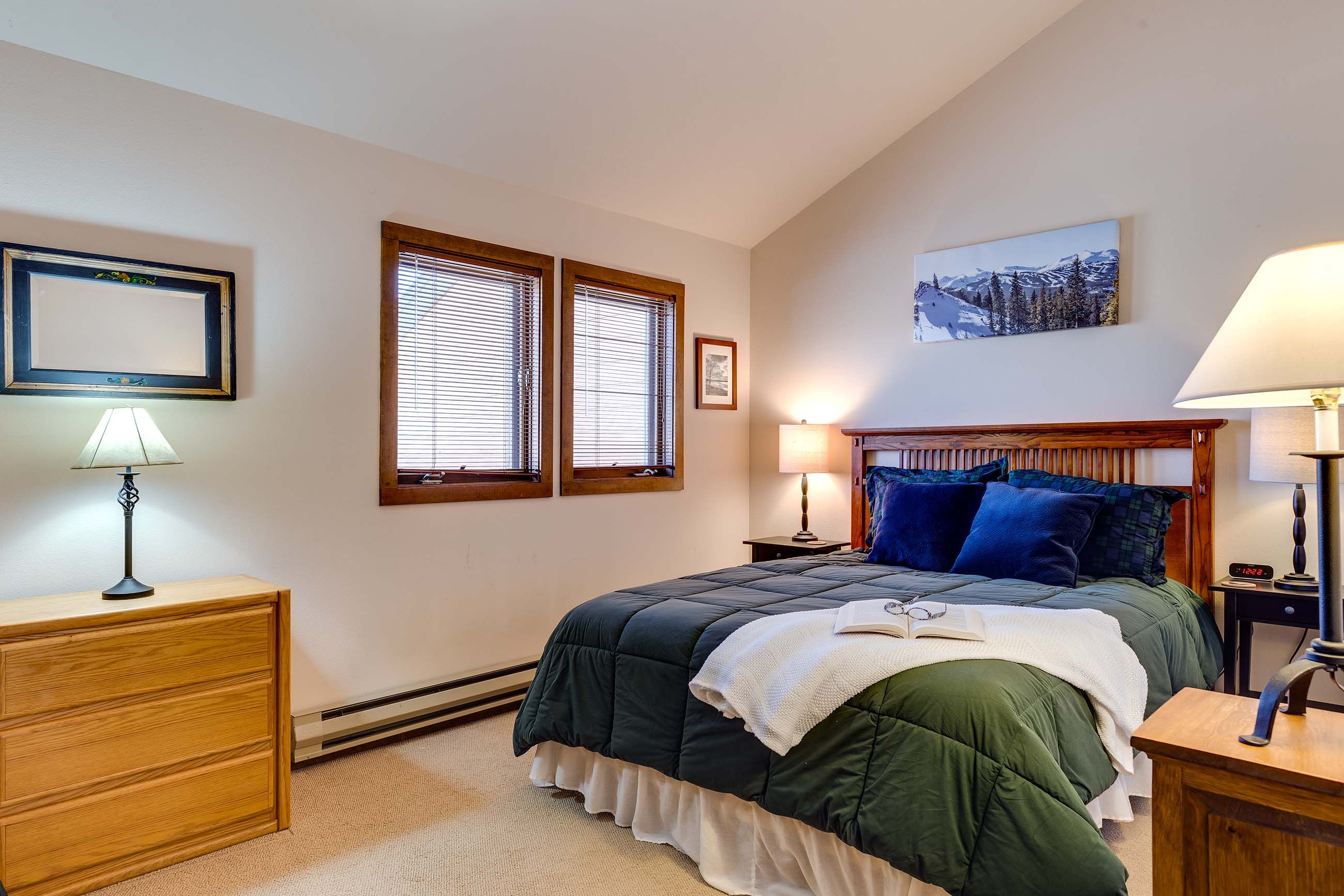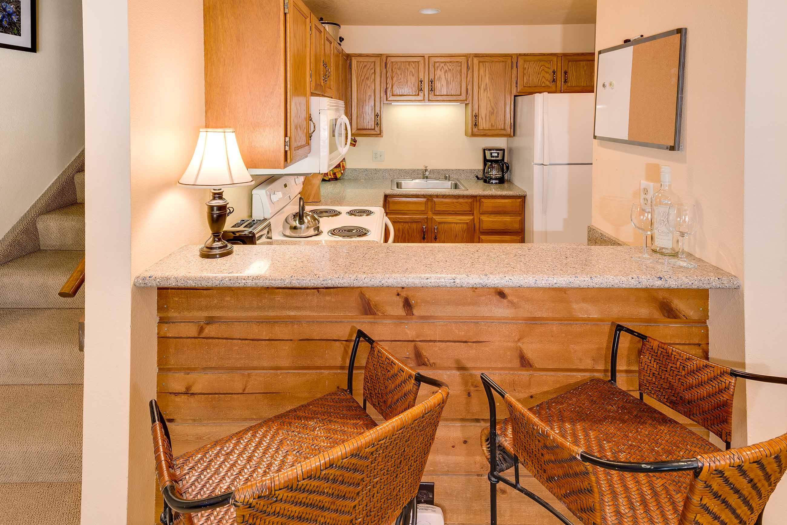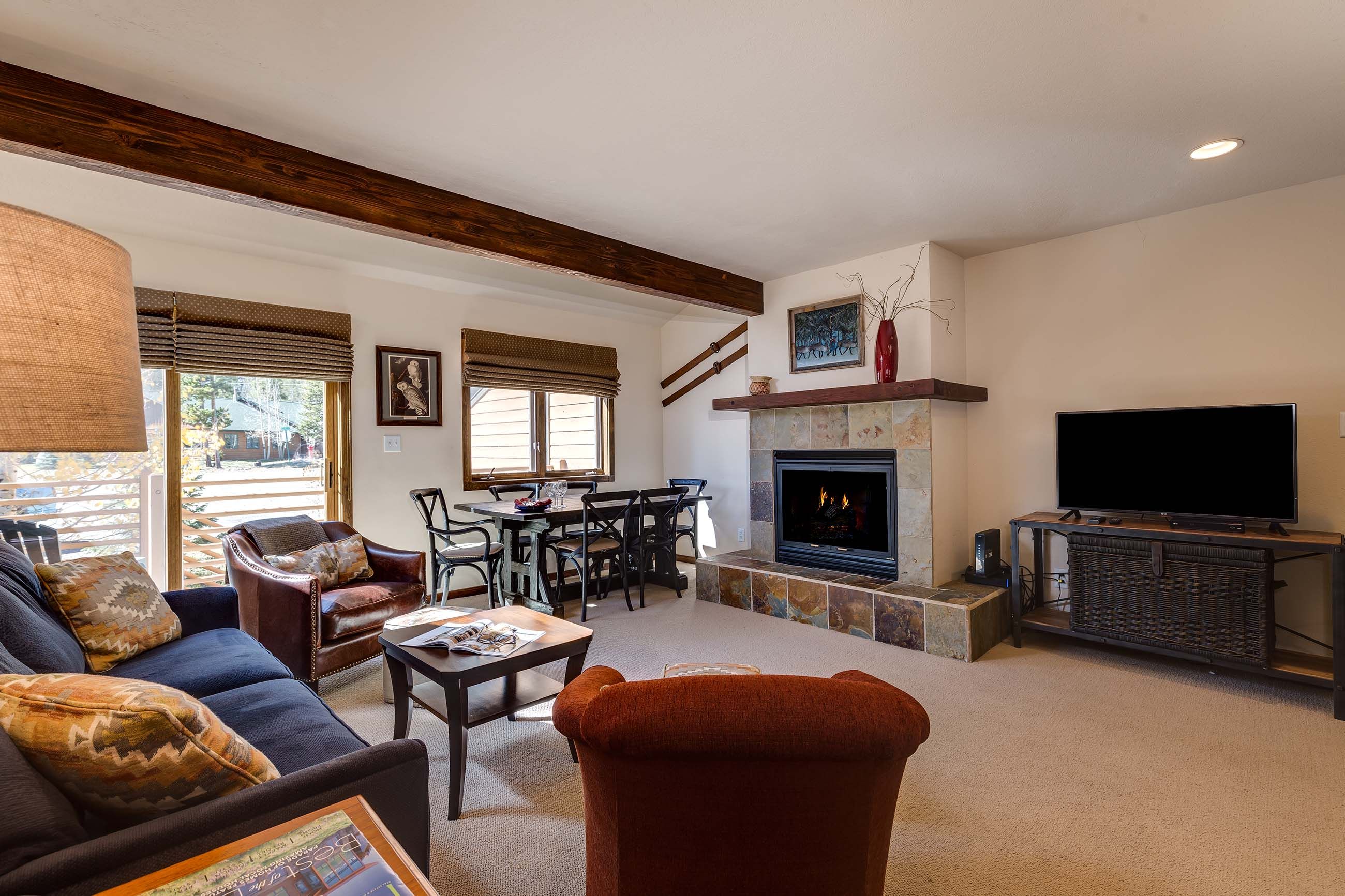 The living area features a slate tile gas fireplace, a large flat-screen TV and Blu-ray player, and plenty of seating for kicking back after a day on the slopes or the bike trails. Just off the living area, the balcony has fantastic views of Frisco’s iconic Mt. Royal. The kitchen has everything you’ll need to whip up tasty meals and après–ski snacks for your hungry group. The dining table seats six, and there’s room for two at the counter.