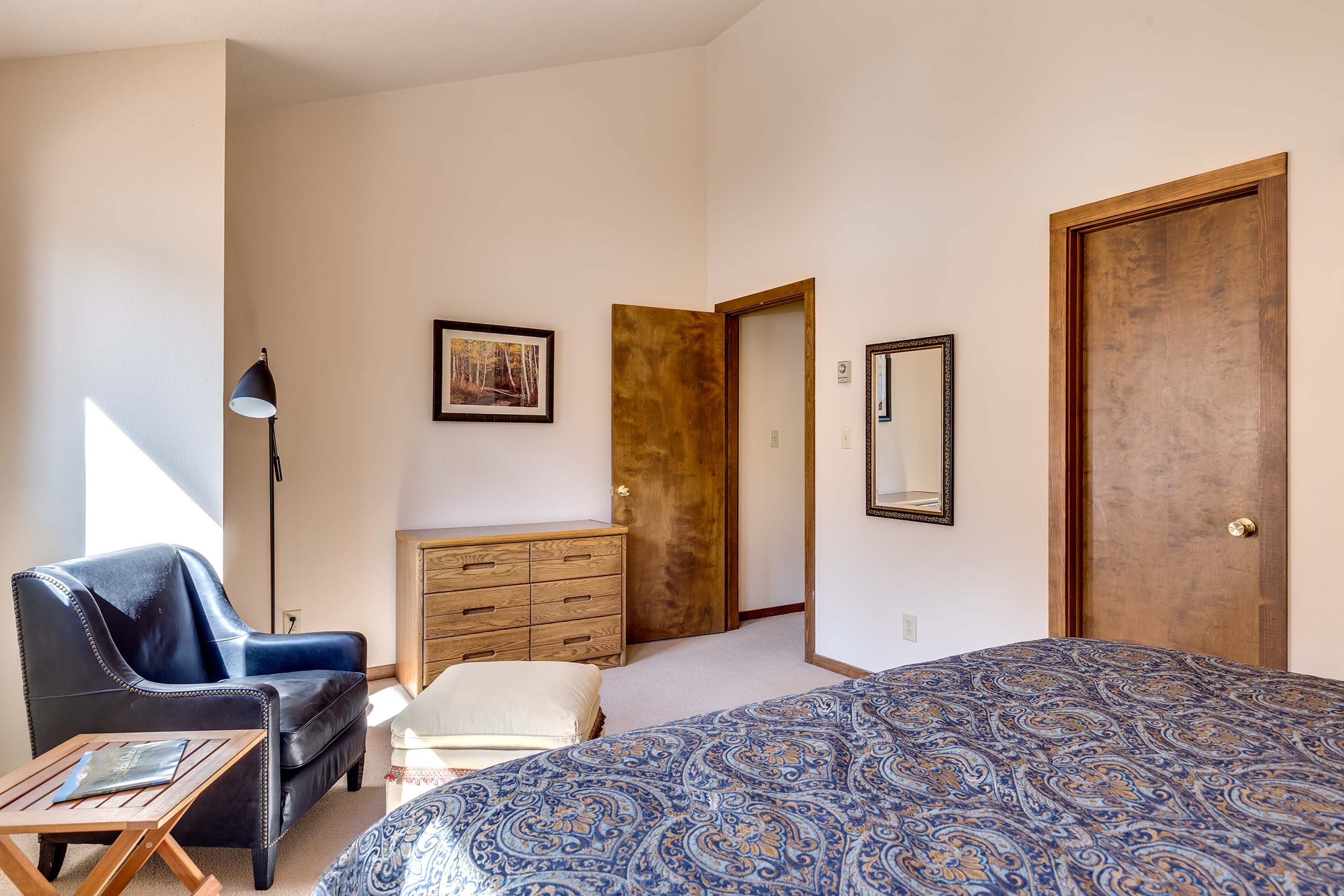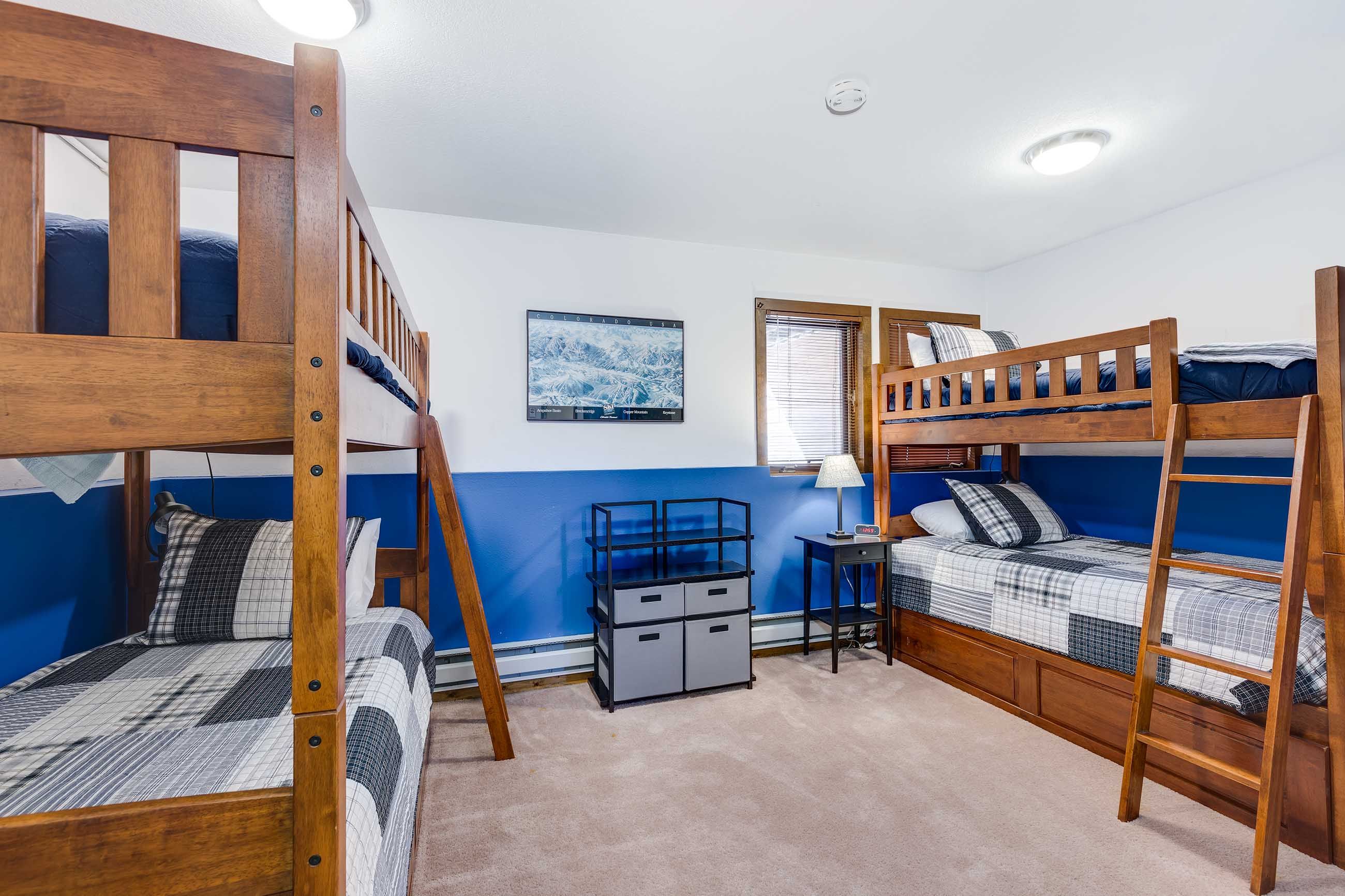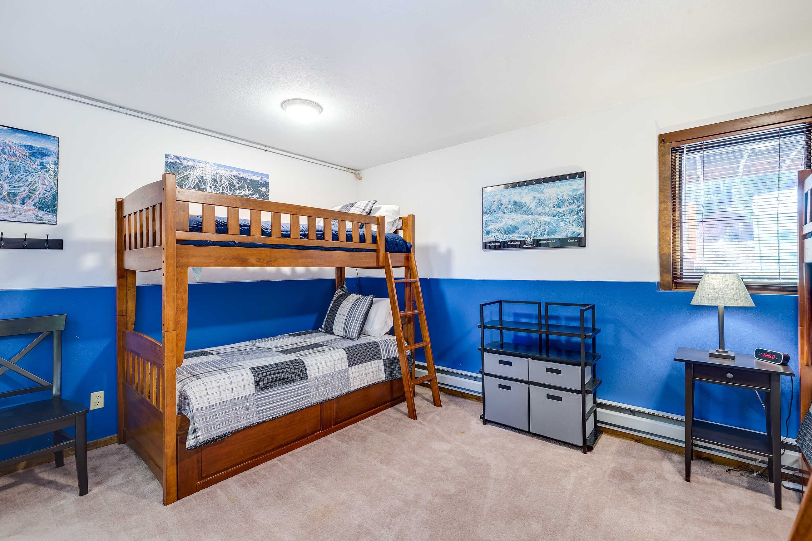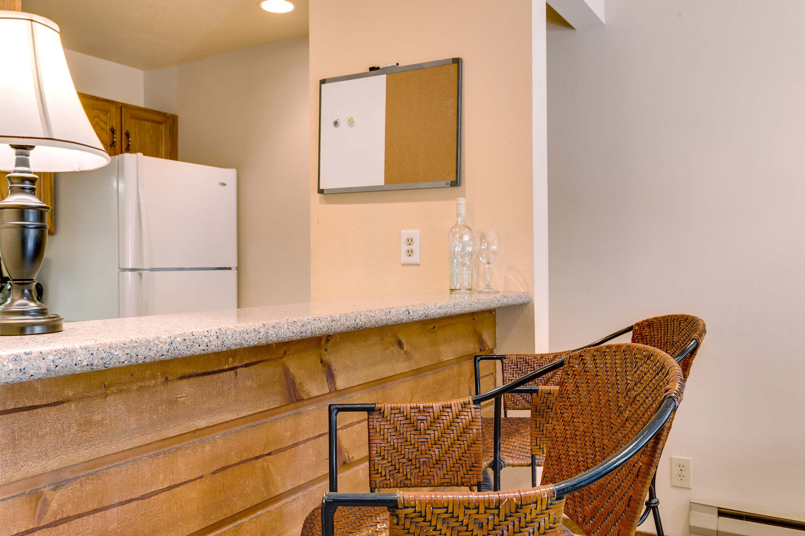 The living area features a slate tile gas fireplace, a large flat-screen TV and Blu-ray player, and plenty of seating for kicking back after a day on the slopes or the bike trails. Just off the living area, the balcony has fantastic views of Frisco’s iconic Mt. Royal. The kitchen has everything you’ll need to whip up tasty meals and après–ski snacks for your hungry group. The dining table seats six, and there’s room for two at the counter.