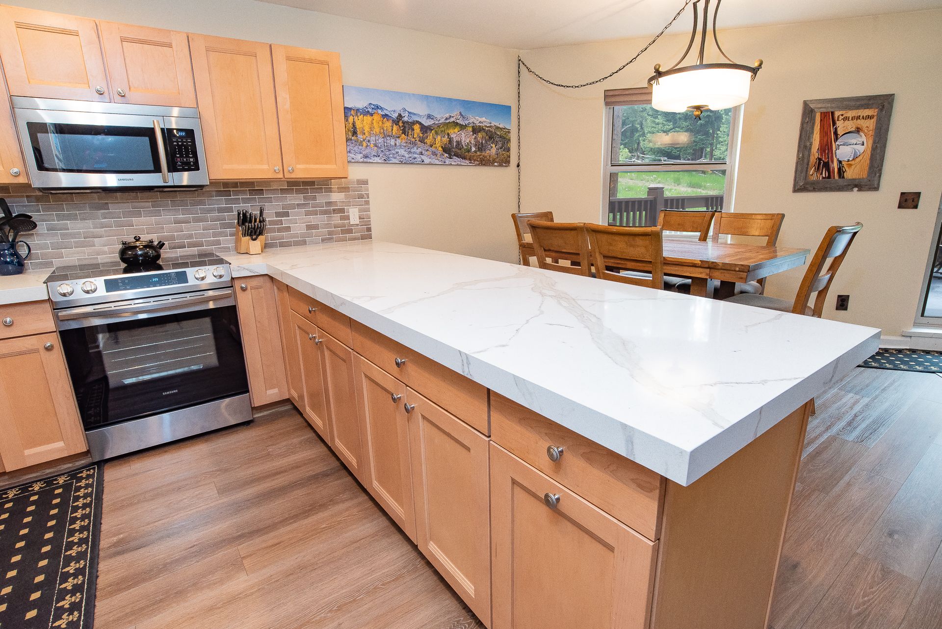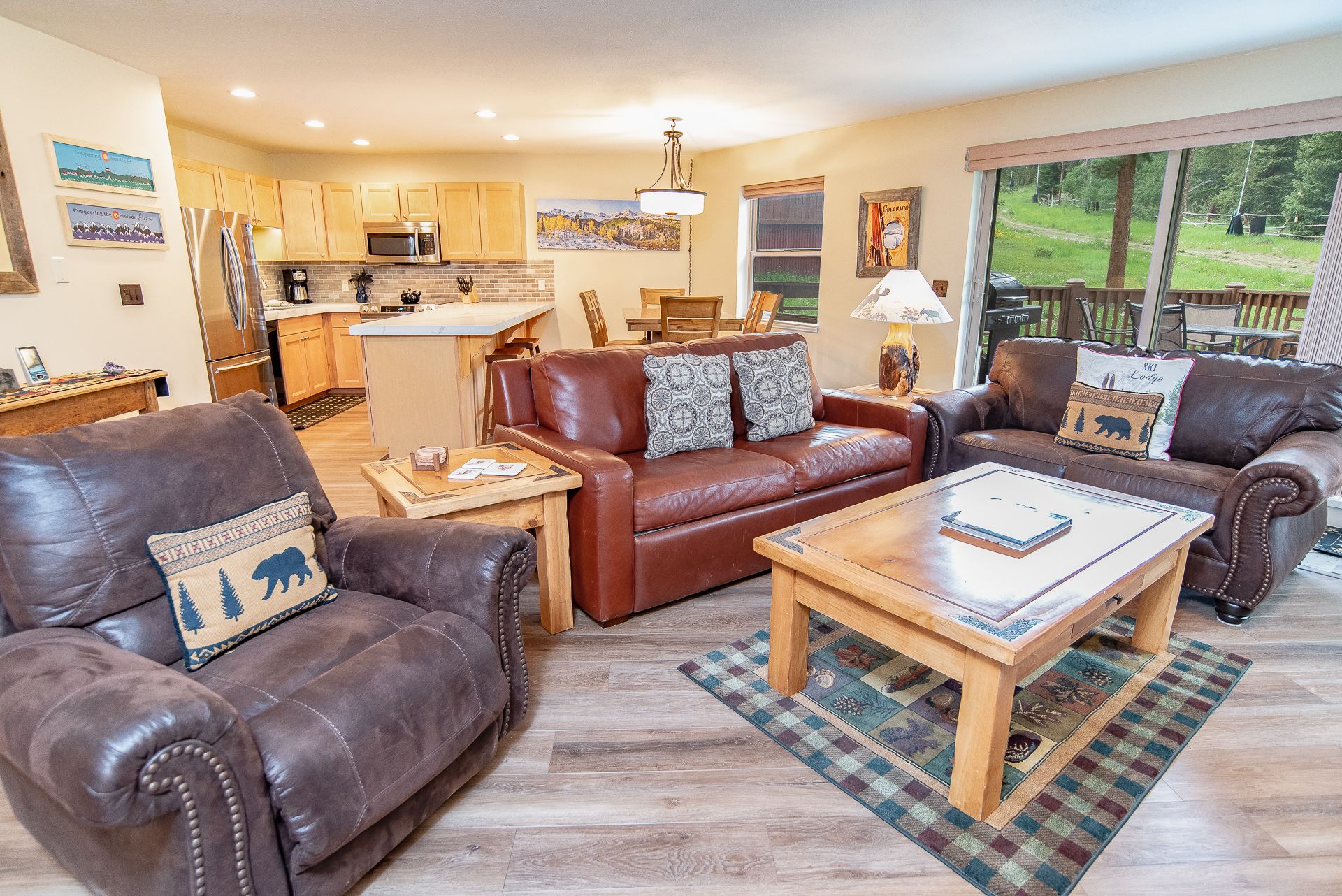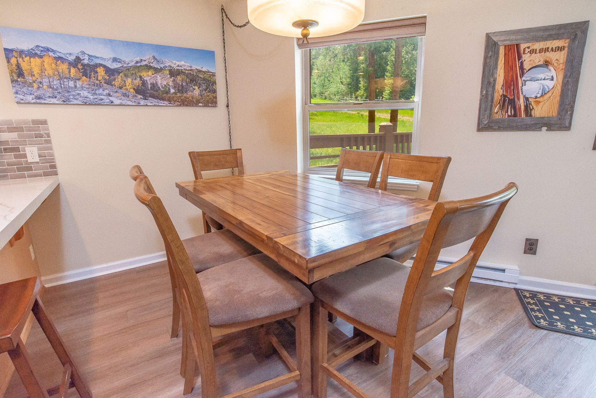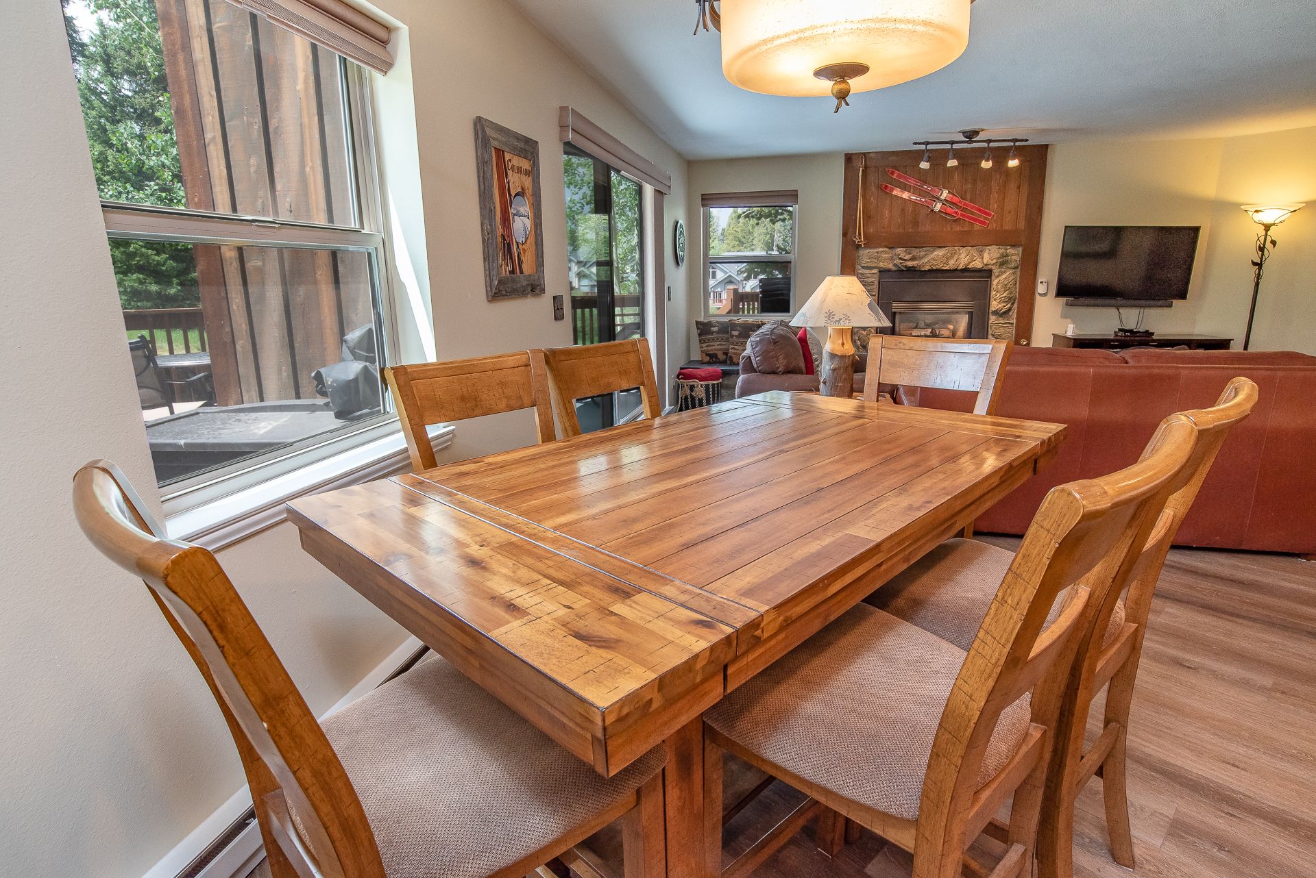 The kitchen features stainless steel appliances and comes equipped with all the gear you’ll need to whip up a memorable meal for your party if you decide to stay in instead of exploring the restaurant scene in Downtown Breckenridge. The dining area is just off the kitchen with seating at the dining room table for six, and there’s two additional seats at the counter.