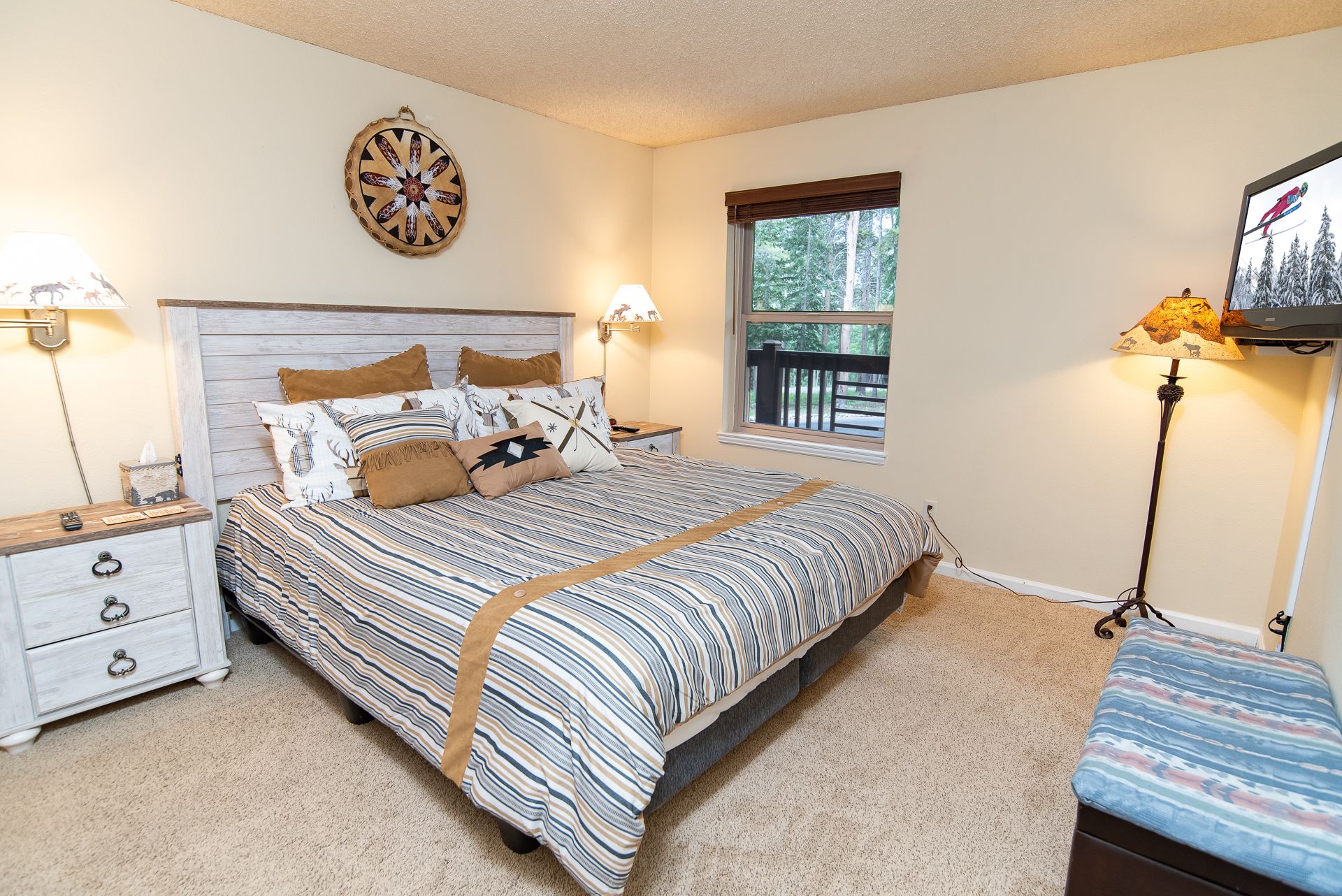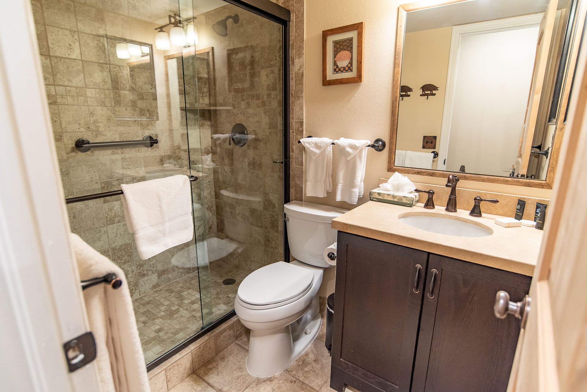 - King master suite: king bed, flat-screen TV, private attached bathroom with granite counters and walk-in tile shower. (sleeps 2)