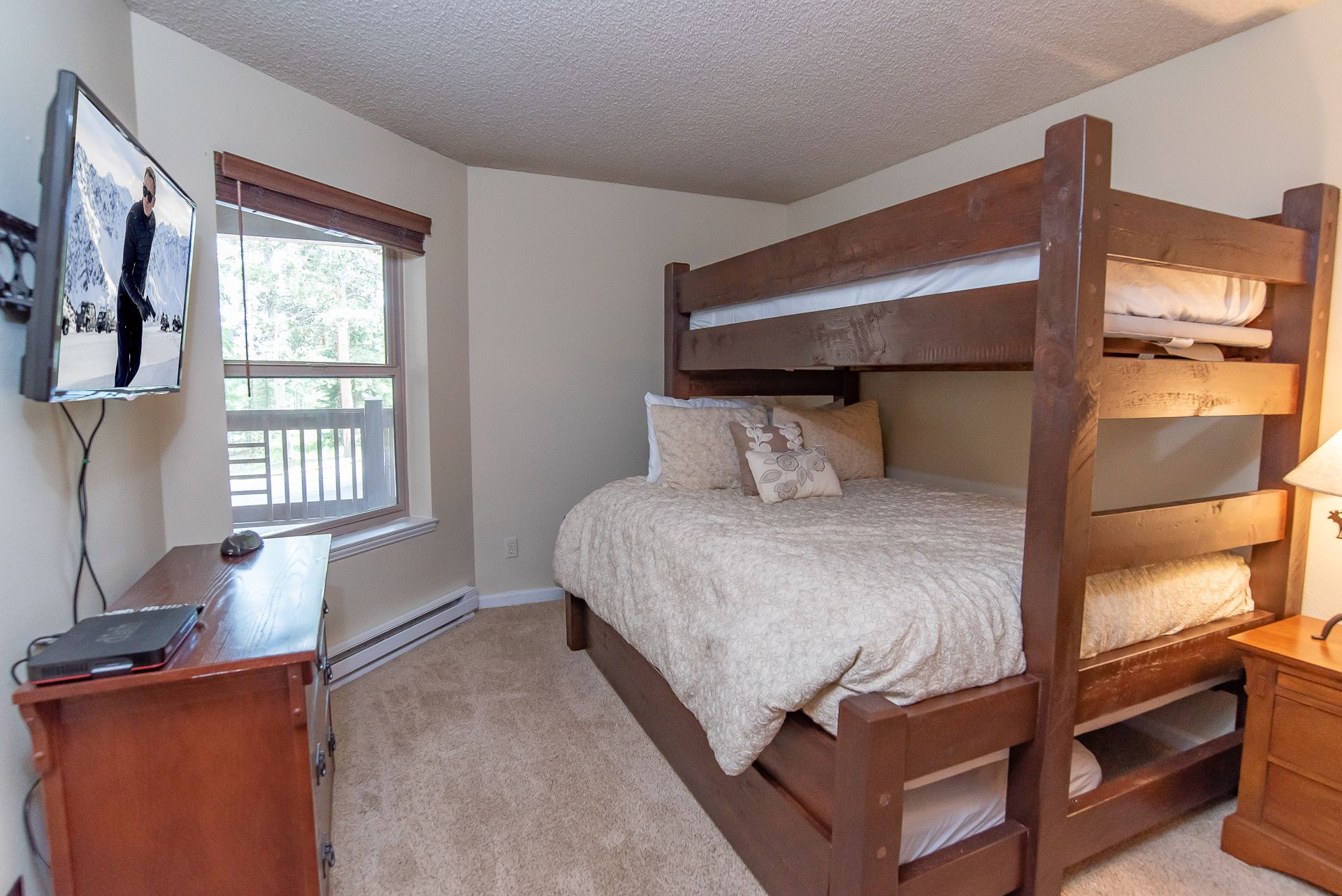 - Bedroom 2: captains’ bunk (twin over queen) with twin trundle and flat screen TV. (sleeps 4)