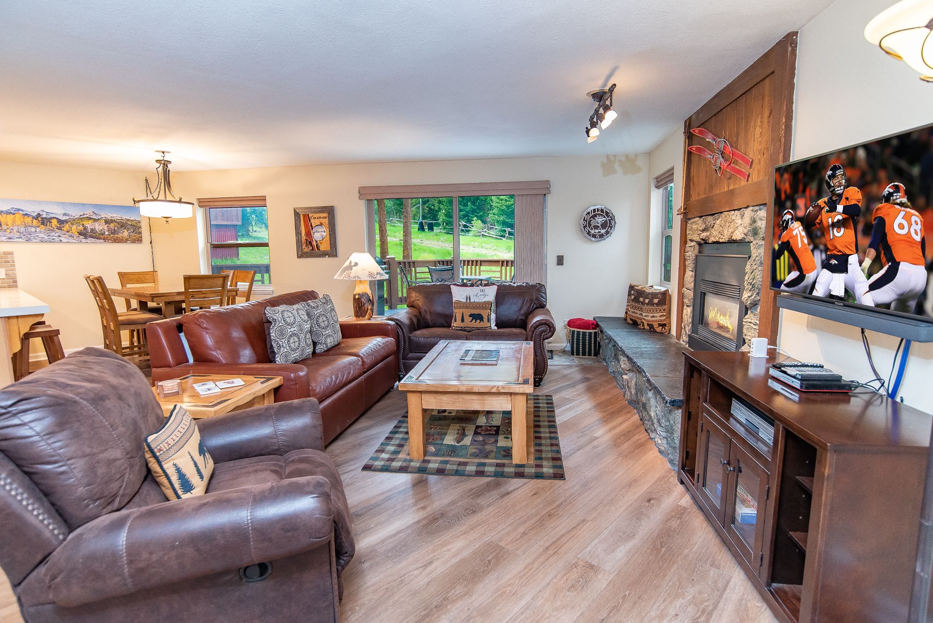 Tyra Summit Colorado Den Condo is a perfectly located, 2-bedroom, 2-bathroom, premium condo that sleeps up to 8 people. Located right next to Four O’Clock ski run and a short 5-minute walk from the free shuttle, you’ll have easy access to everything Breckenridge has to offer! You’ll also love the nice finishes in this updated property. The living area is an open concept with the living room, kitchen, and dining area all open to each other so you can enjoy the company of your fellow travelers as you take in the view of the ski run right outside the plentiful windows. There’s a gas fireplace and a large flat-screen TV with complimentary cable so you can watch your favorite shows or catch the game.