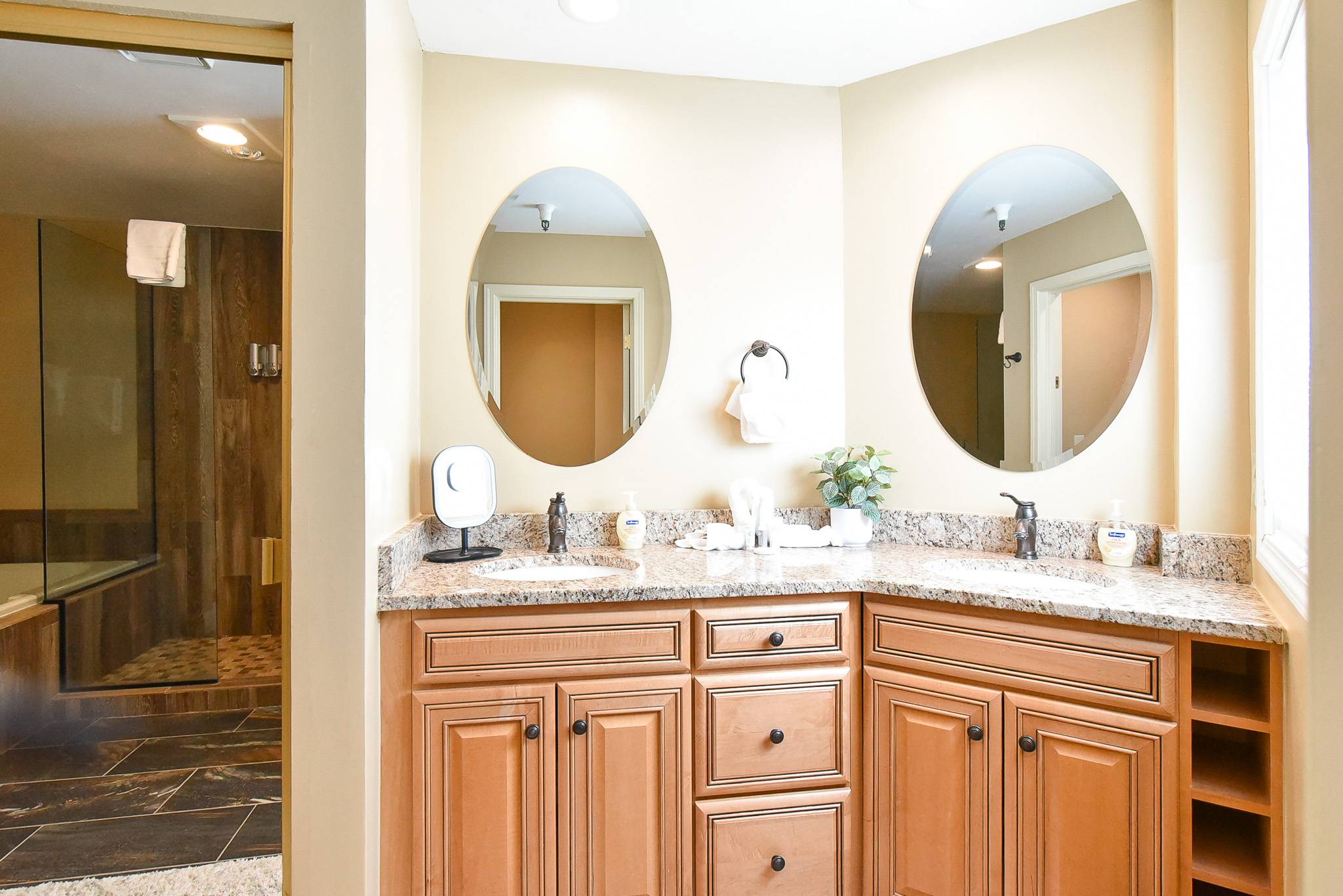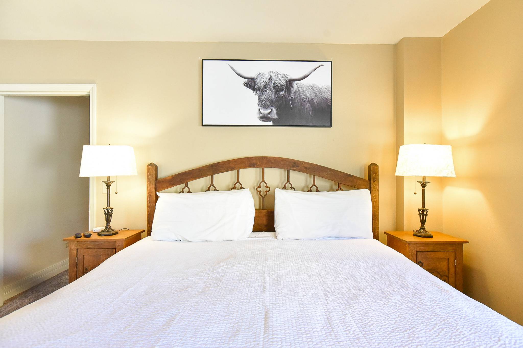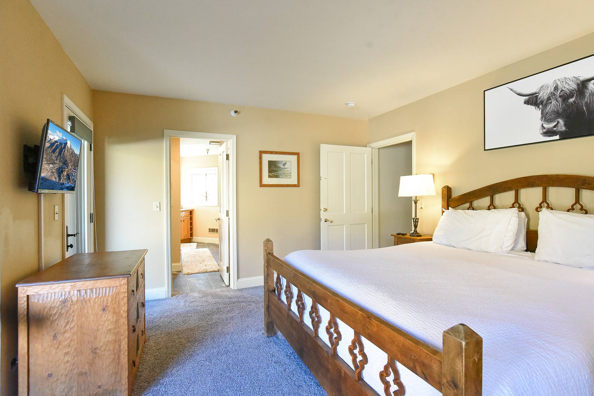 • King Suite Bedroom: king bed, private bathroom with soaking tub and walk-in shower, private door to patio, smart tv. (sleeps 2)
