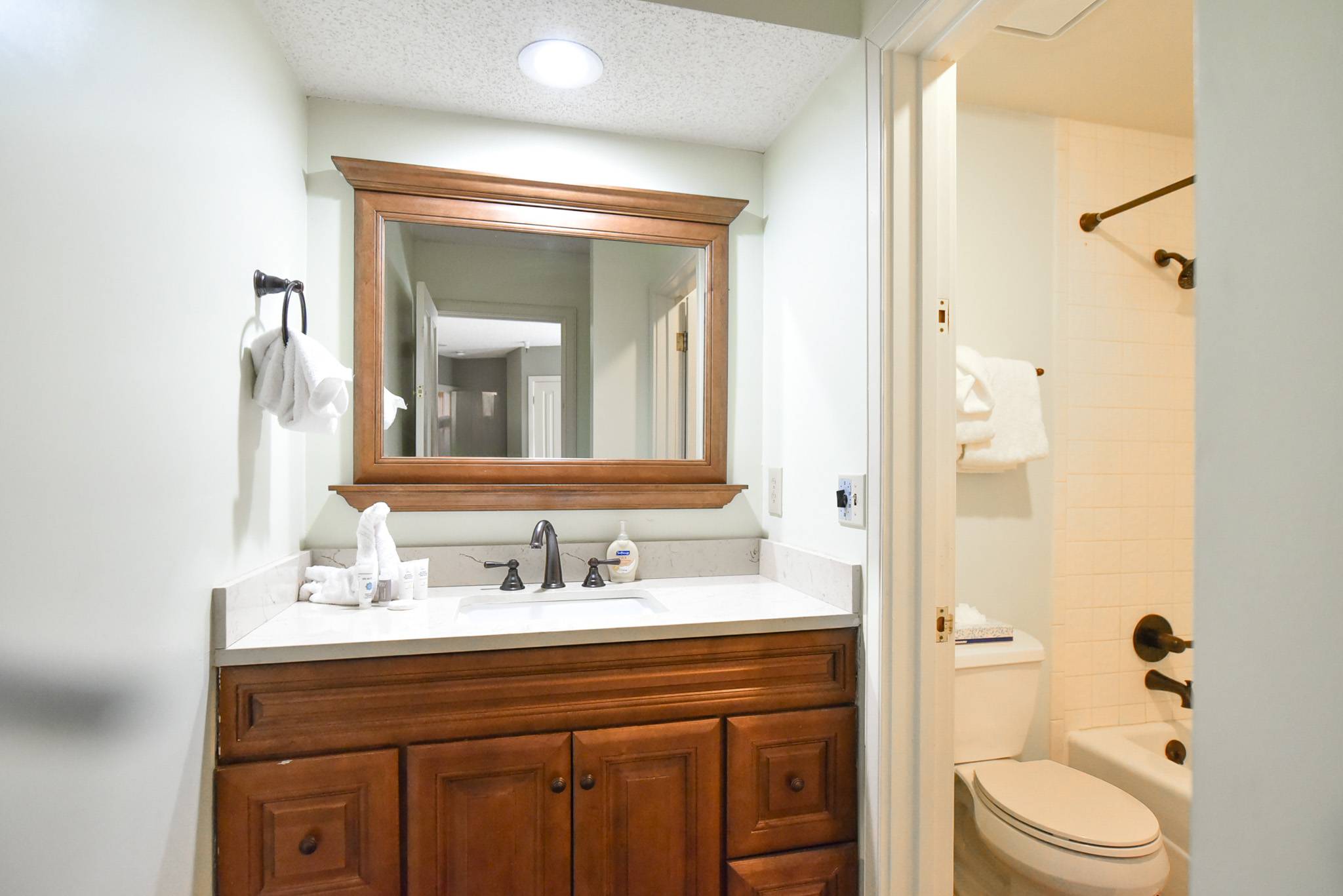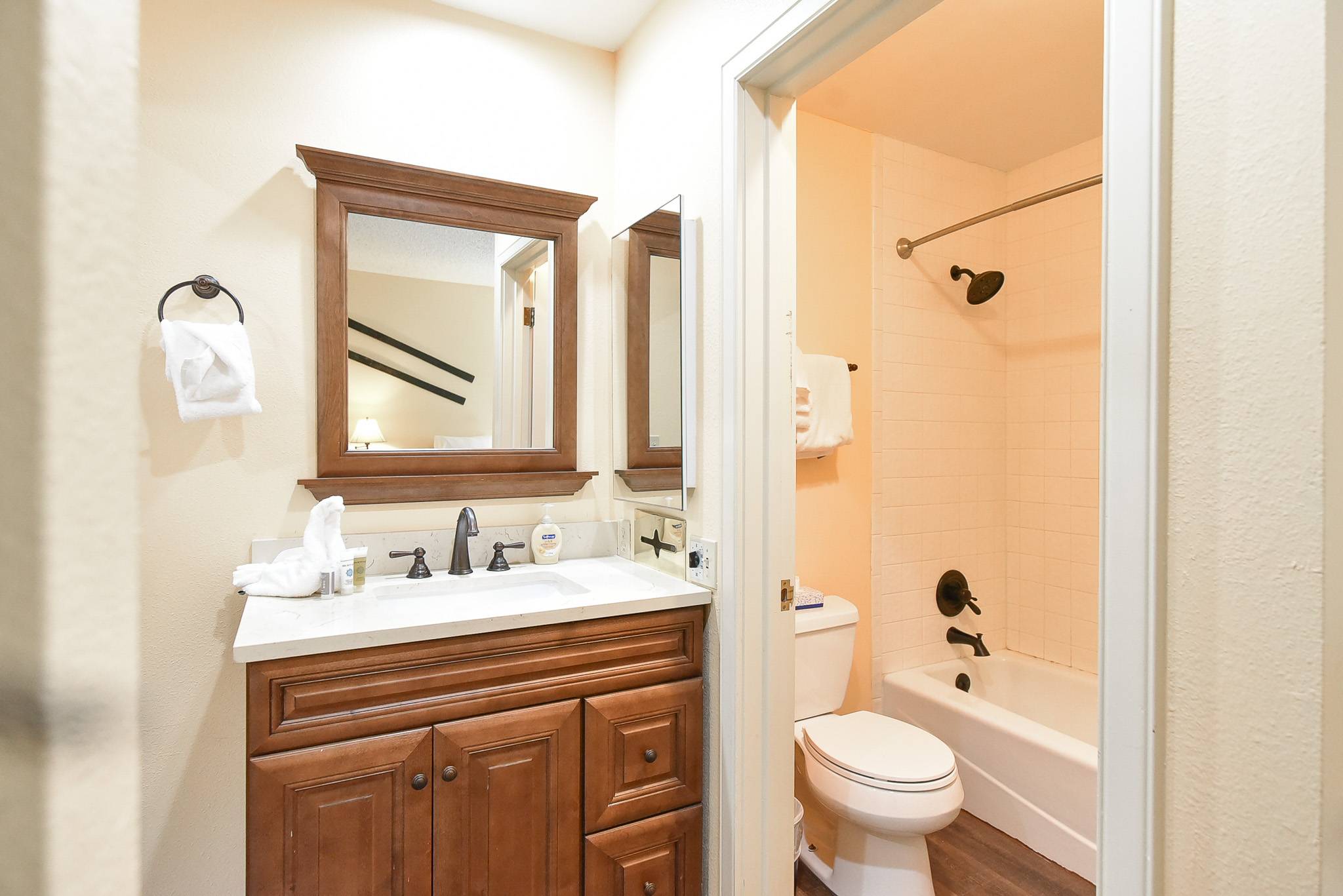 • Queen Suite Bedroom: queen bed, private bathroom with shower/tub combo, smart tv. (sleeps 2)