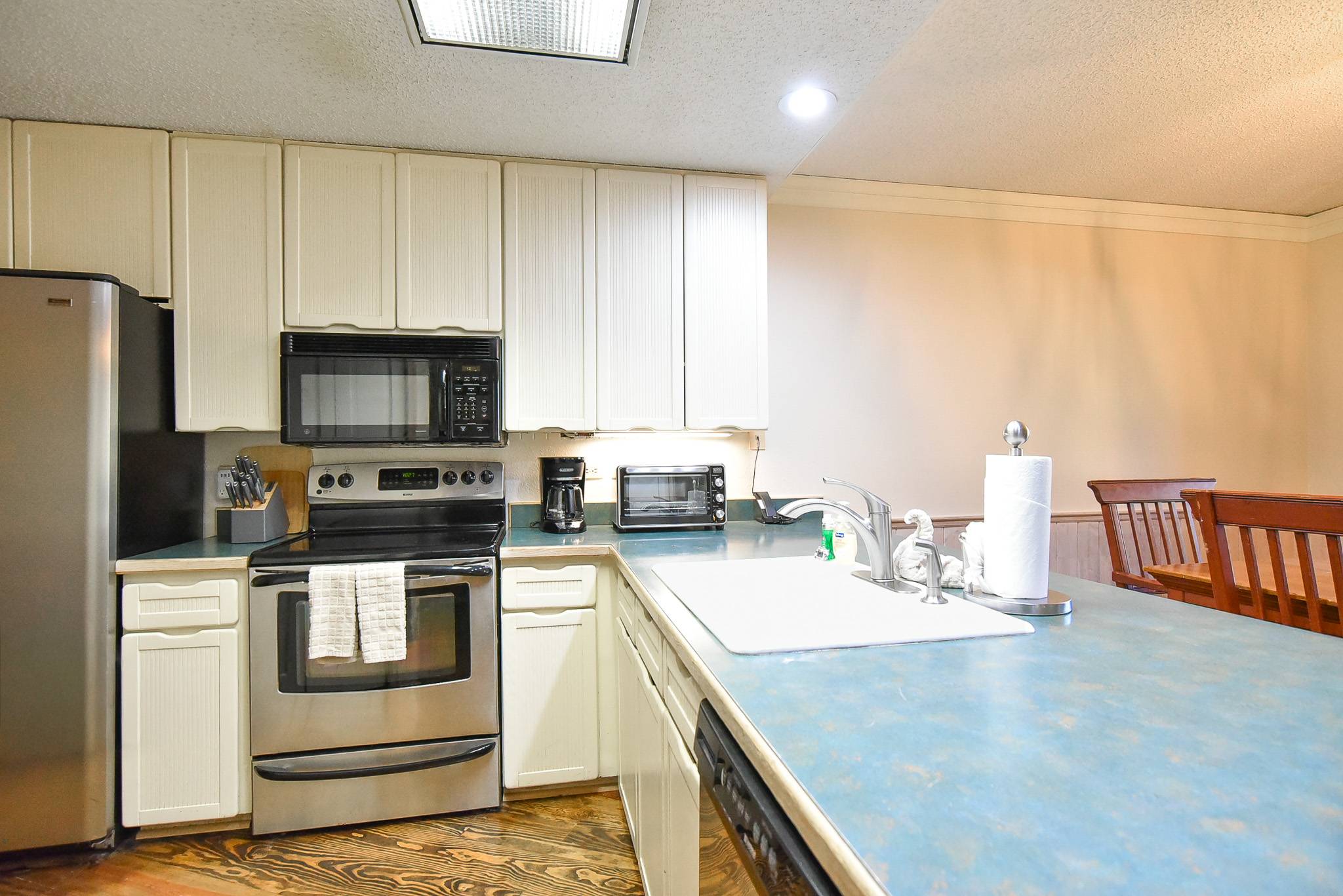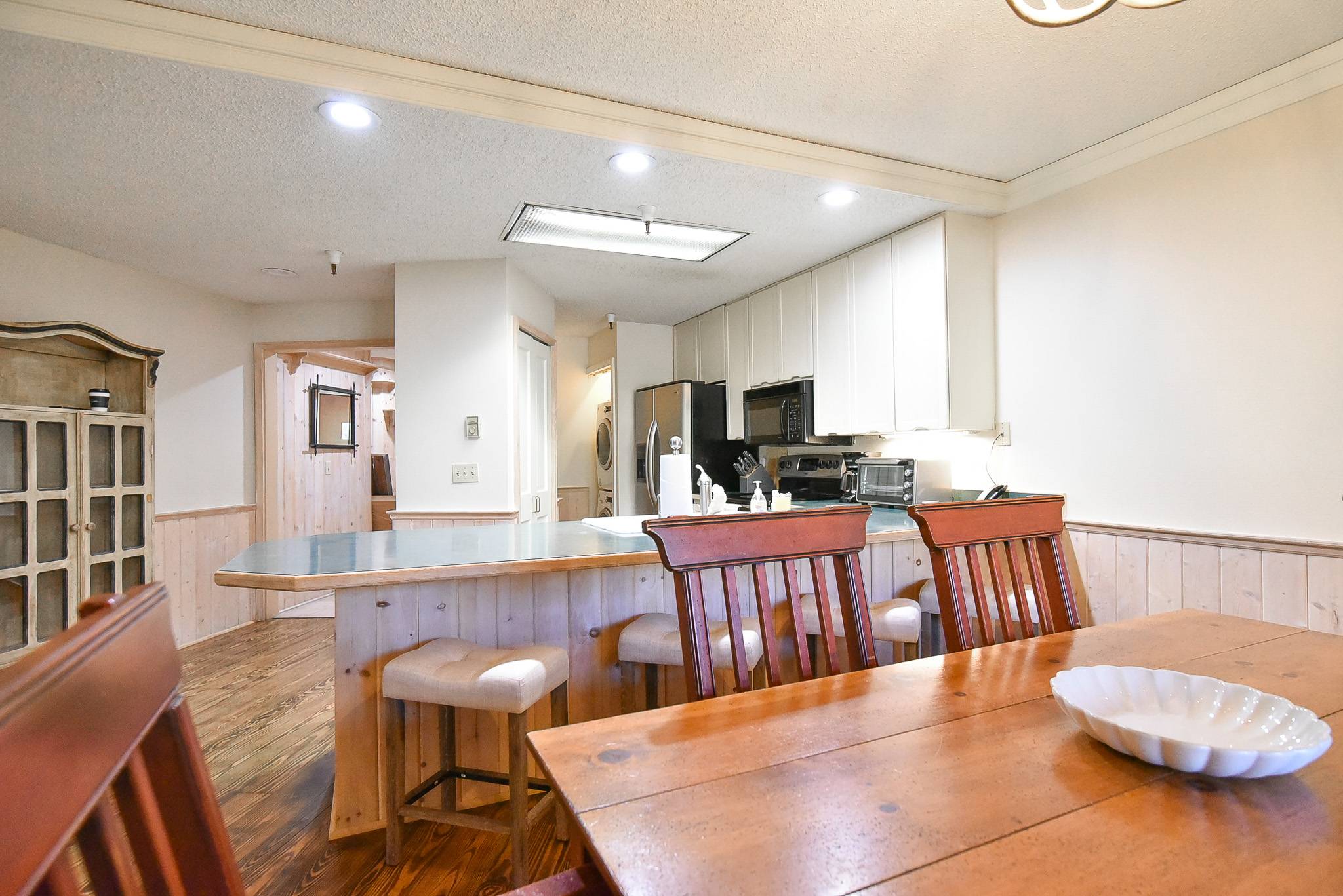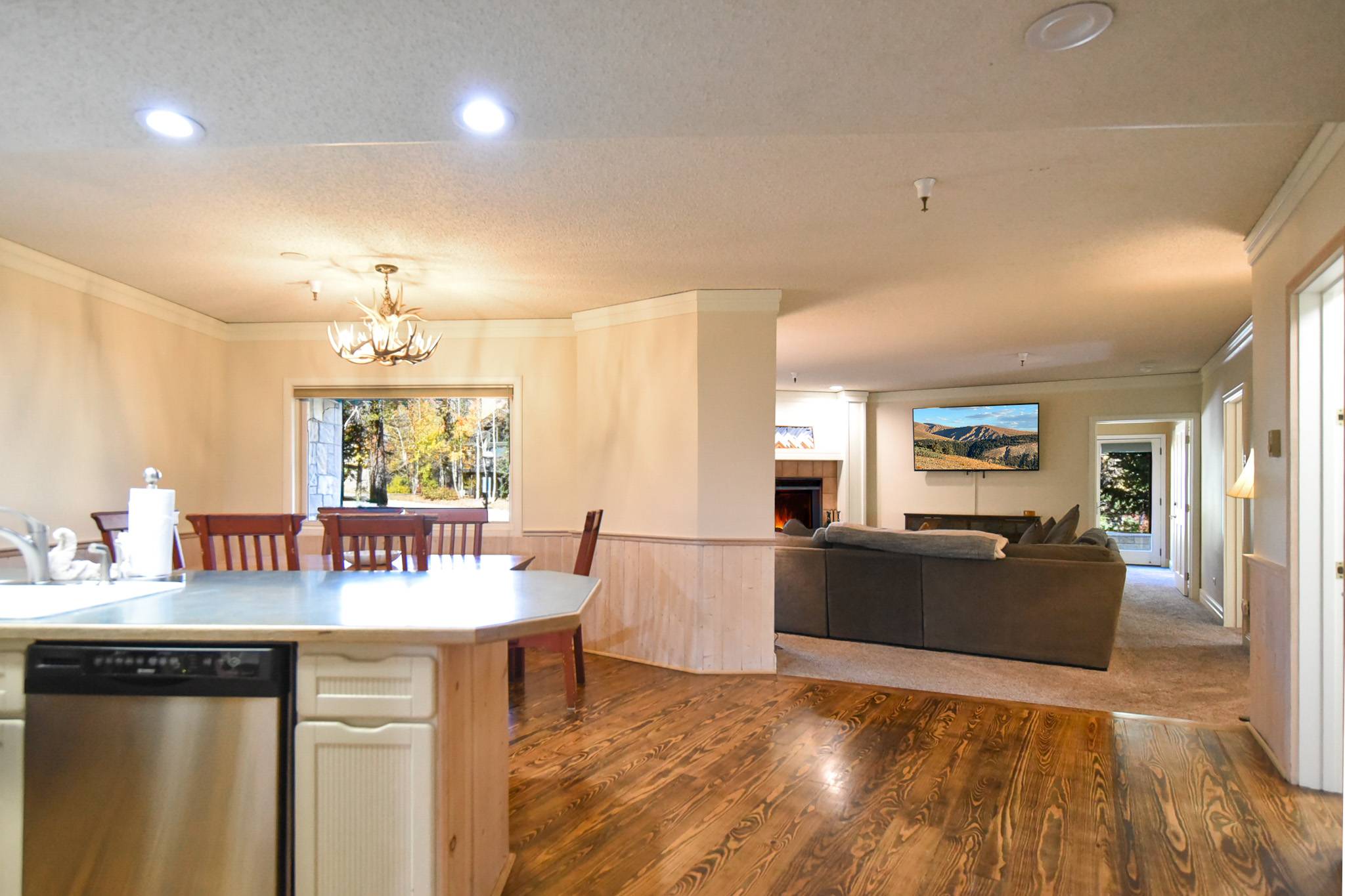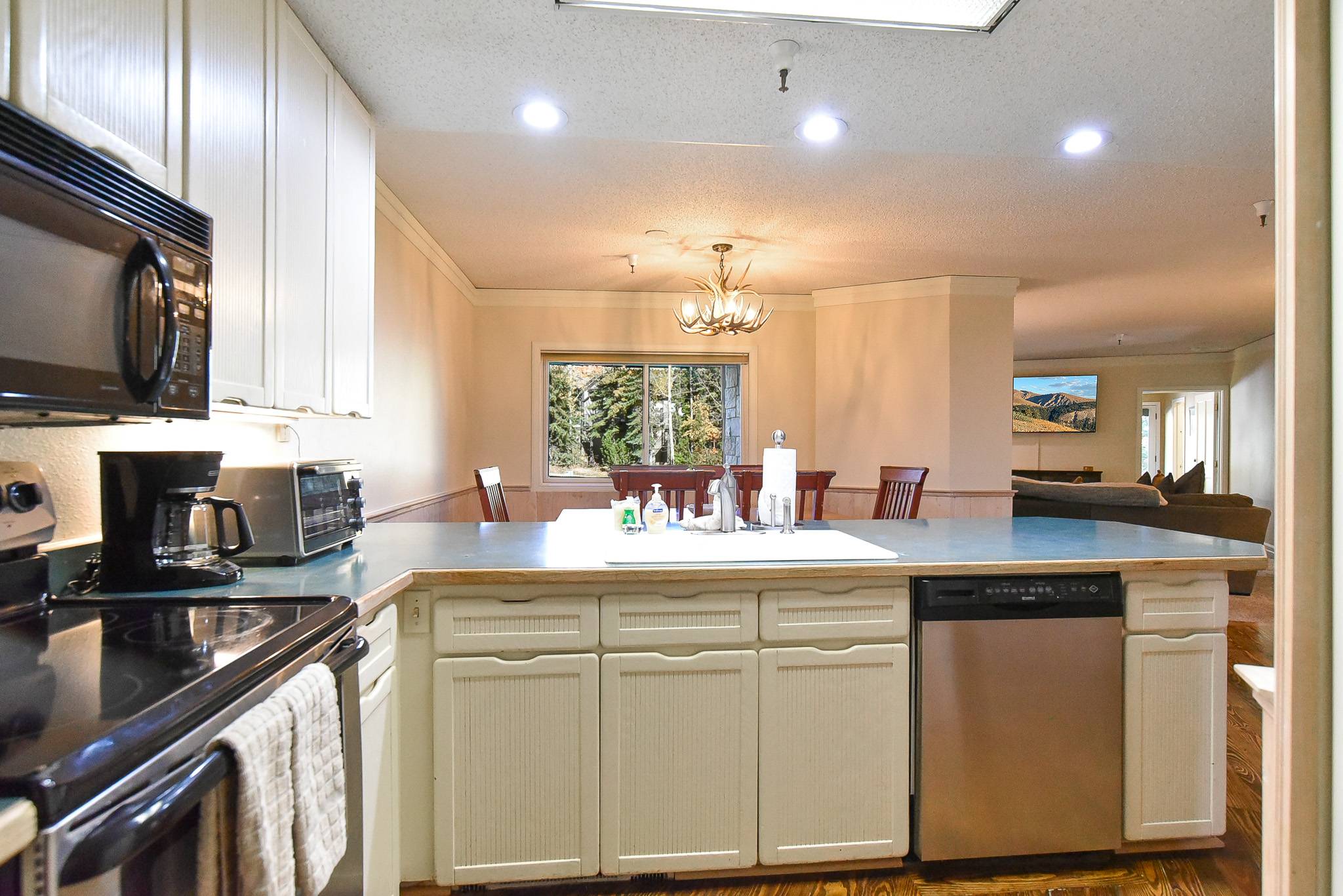 Inside, the condo features a large open living area with a gas fireplace, smart TV, and generous dining space — perfect for gathering after a day on the mountain. The kitchen offers everything needed for easy meal prep and connects directly to the living space for seamless entertaining. Being a ground-level unit, it provides direct access to The Village Plaza so you can start your day right from your door. A convenient half bathroom is located off the main living area for shared guest use.