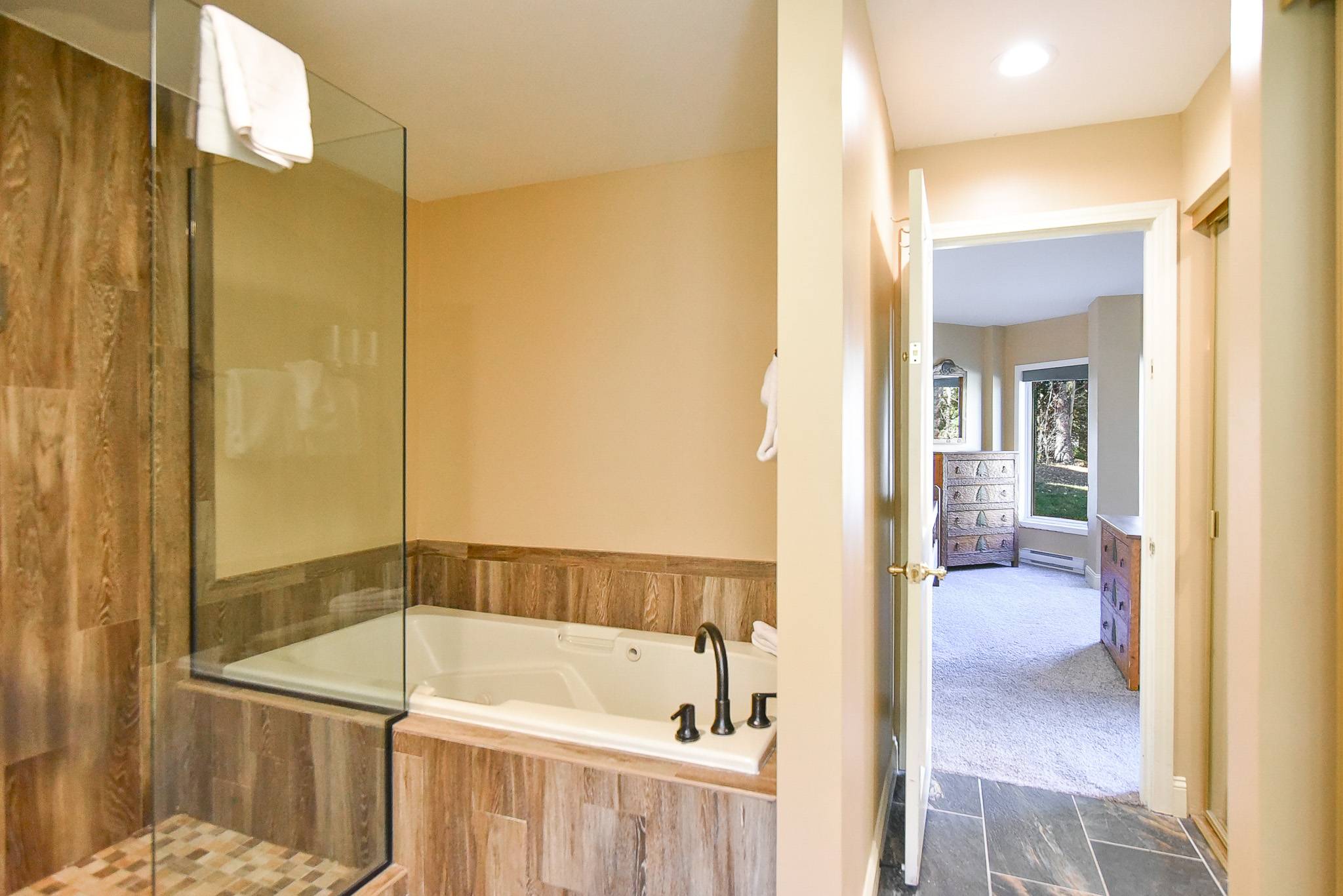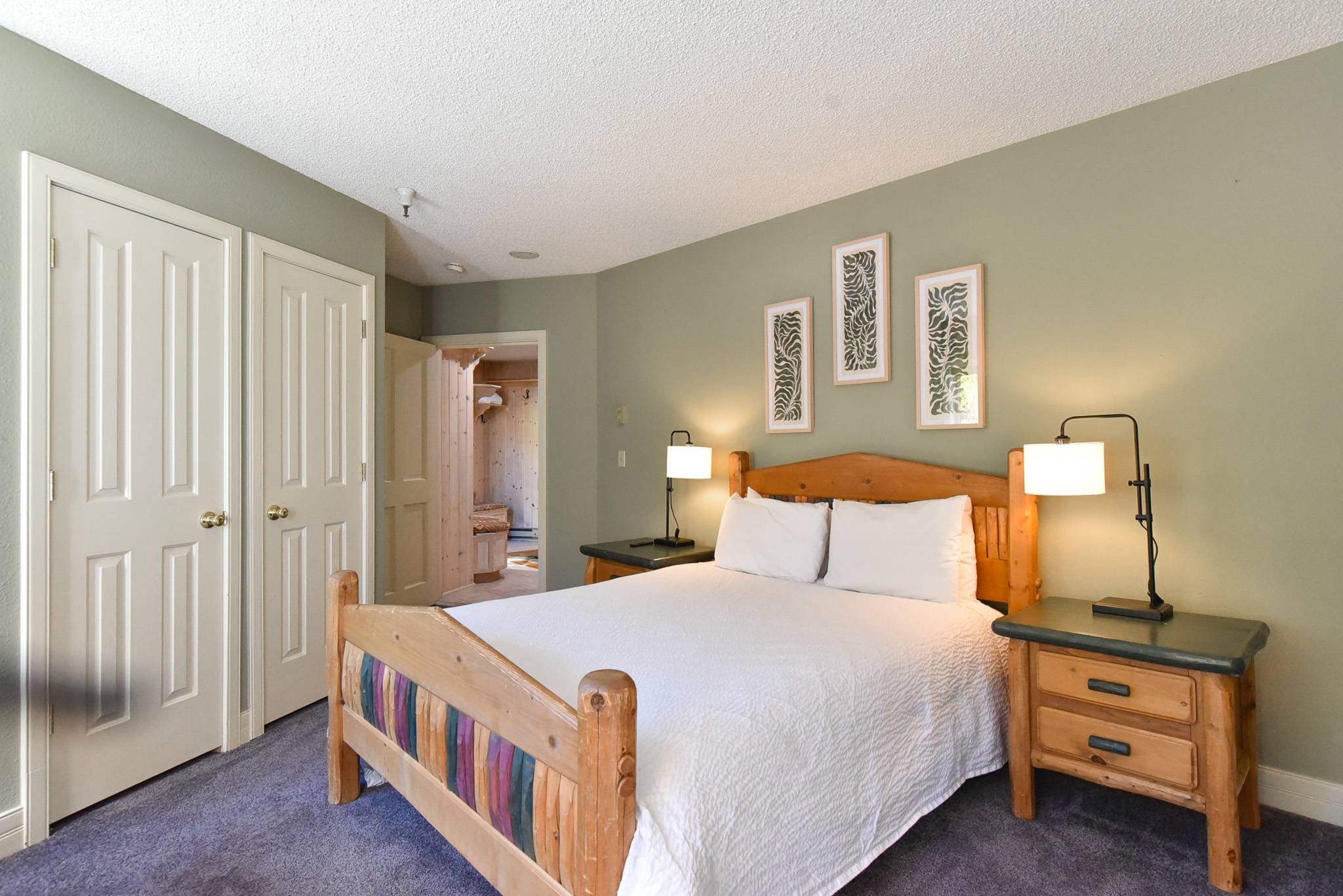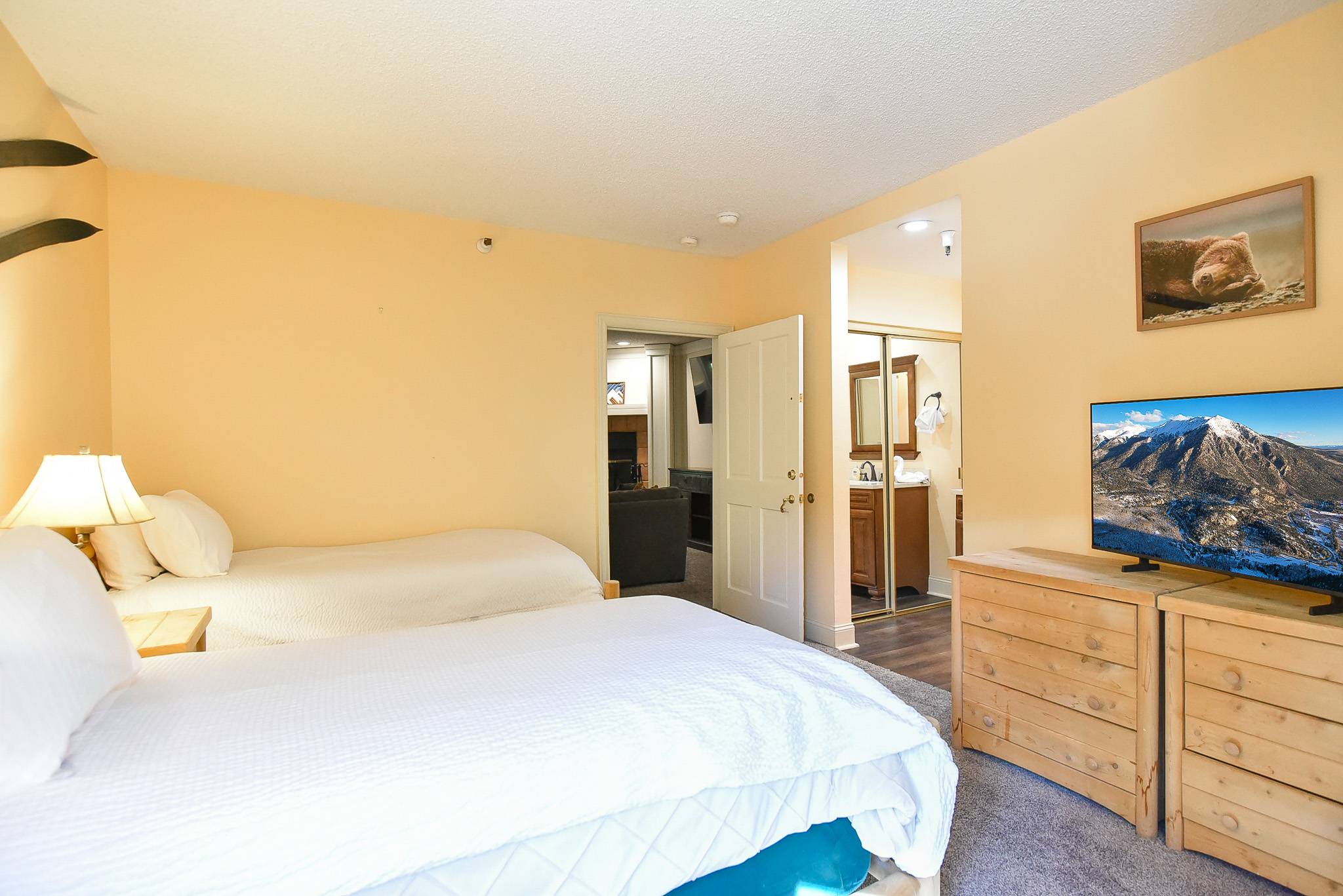 Each of the three bedrooms is a private suite, offering comfort and space for every guest. The king suite features a private patio, smart TV, and ensuite bathroom with a soaking tub and walk-in shower. The queen suite also includes its own ensuite bath and smart TV, while the twin suite offers two twin beds, a smart TV, and a private ensuite bathroom with a shower/tub combo. With plenty of room to spread out, Village Chateaux Off-Piste Retreat is ideal for families or groups who want to enjoy Breckenridge together. Whether you’re here to ski, hike, or simply relax in the heart of it all, this condo offers the perfect home base for your mountain getaway.