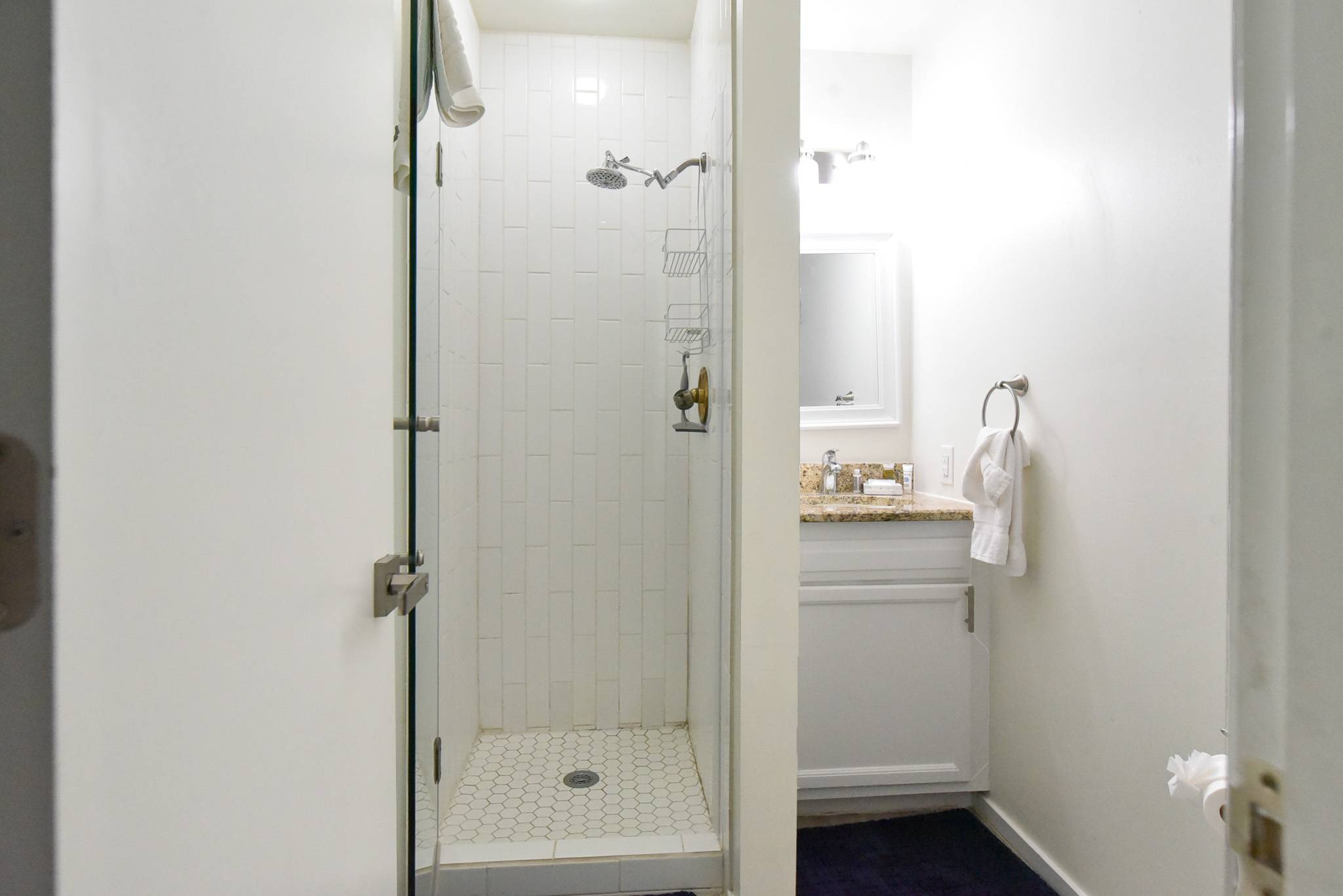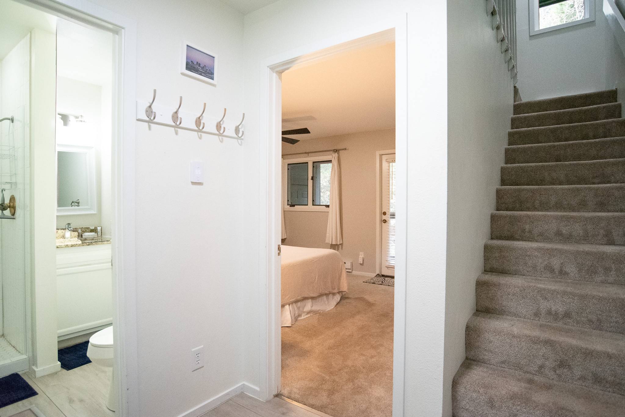 Upstairs, you’ll find the inviting king master bedroom with a shared ensuite bathroom featuring a shower/tub combo. This bedroom also includes a dedicated workspace and mountain views—ideal for remote workers or anyone wanting to stay connected while away. A sleeper sofa in the upper living area provides extra sleeping space for guests. On the lower level, the second bedroom includes a queen bed and twin bunk bed, Smart TV, and access to a private lower patio, as well as a nearby full bathroom with shower and a full-size washer and dryer for added convenience.